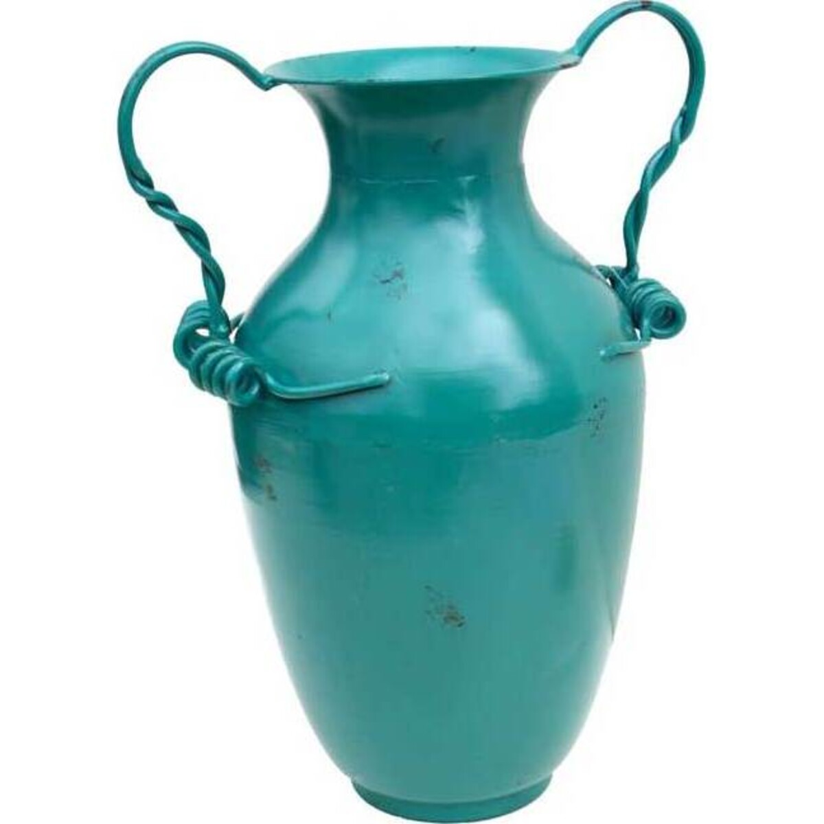 Just about a foot tall this beautiful antique look metal urn has some amazing features that defines its looks. The wide mouth should allow one to fill it up with garden fresh flowers or simply allow it to stand among many potted plants or other crafts and curios to make that part of the home look splendidly classy. The gorgeous antique blue paintwork is peeling in certain places?making the vase acquire the look of aging beauty. The handles are painstakingly crafted by hand by a master metal smith to give it a neat and smooth finish. The shape of the vase is the typical oblong shape with a clear neck and wide mouth and the exteriors has been given a neat polish and shine. A great way to spruce up a dull corner of the home. A durable piece that will be as low maintenance as possible and equally be easy to blend into any kind of home d??cor.