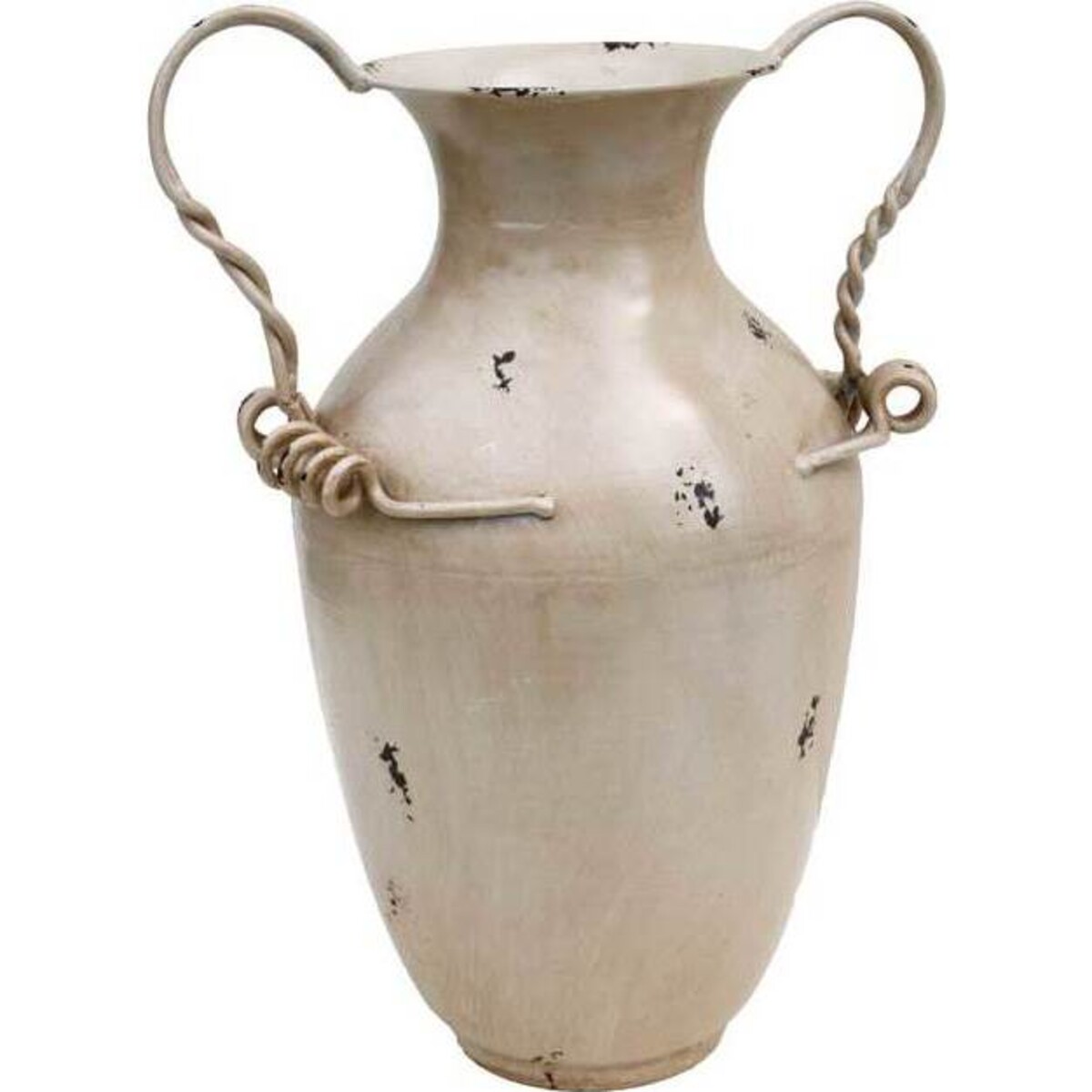 The fine polish on the enameled exterior has been well created to give a dull feel very in tune with the antique look of this metal vase. The paint work is chipped in certain places giving the appearance of a genuine antique. The detailing of the arm is in a grapevine design, delicate and very neatly welded on to the main body. The base is stable giving this vase real utility for placing flowers and twigs or any sort of more contemporary arrangement. Will add a great deal of class to the décor and will fit into any corner with ease. If made apart of the dining table will look great with large blooms and garden fresh flowers. The enamel on the vase gives it a dull shine and the body has a smooth and neat finish. It's definitely a stylish vase with a contemporary twist.