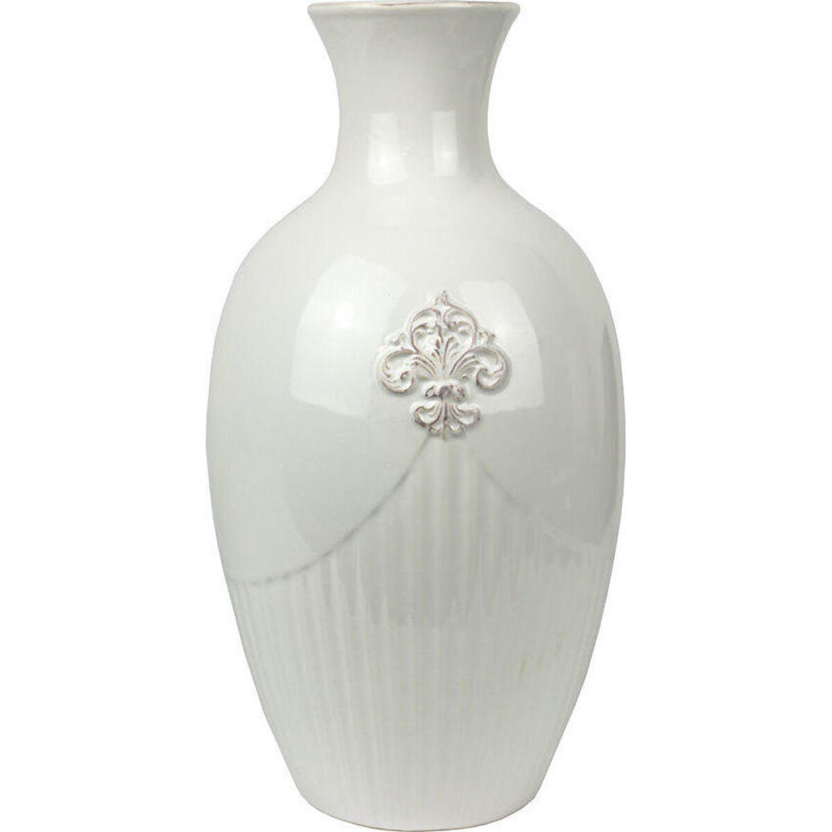 Giving spaces, a facelift can be rather easy with inclusion as simple and basic as this. Here is a beautifully designed white vase made of ceramic given w glaze and a design that follows the classic tradition of fine pottery. The rippled exterior rises in delys pattern that add a touch of antiquity to it. The white exterior makes the design stand out all the more - the soft ripples rising to a peaked hinge where it meets the de lys pattern. Add this you your console, the study, the side board or even your dresser and lend the space with an appeal that can seldom come from things less classy. The vase is 20 cm tall, it's mouth is all and thus would be suitable to hold long stemmed flowers. The round curved body ends at base in tapered way. The smooth top gets aligned wonderfully with the contrasting rippled lower half. The design will surely add a touch of vintage charm in your spaces and help you allow create the most riveting of floral arrangements.
