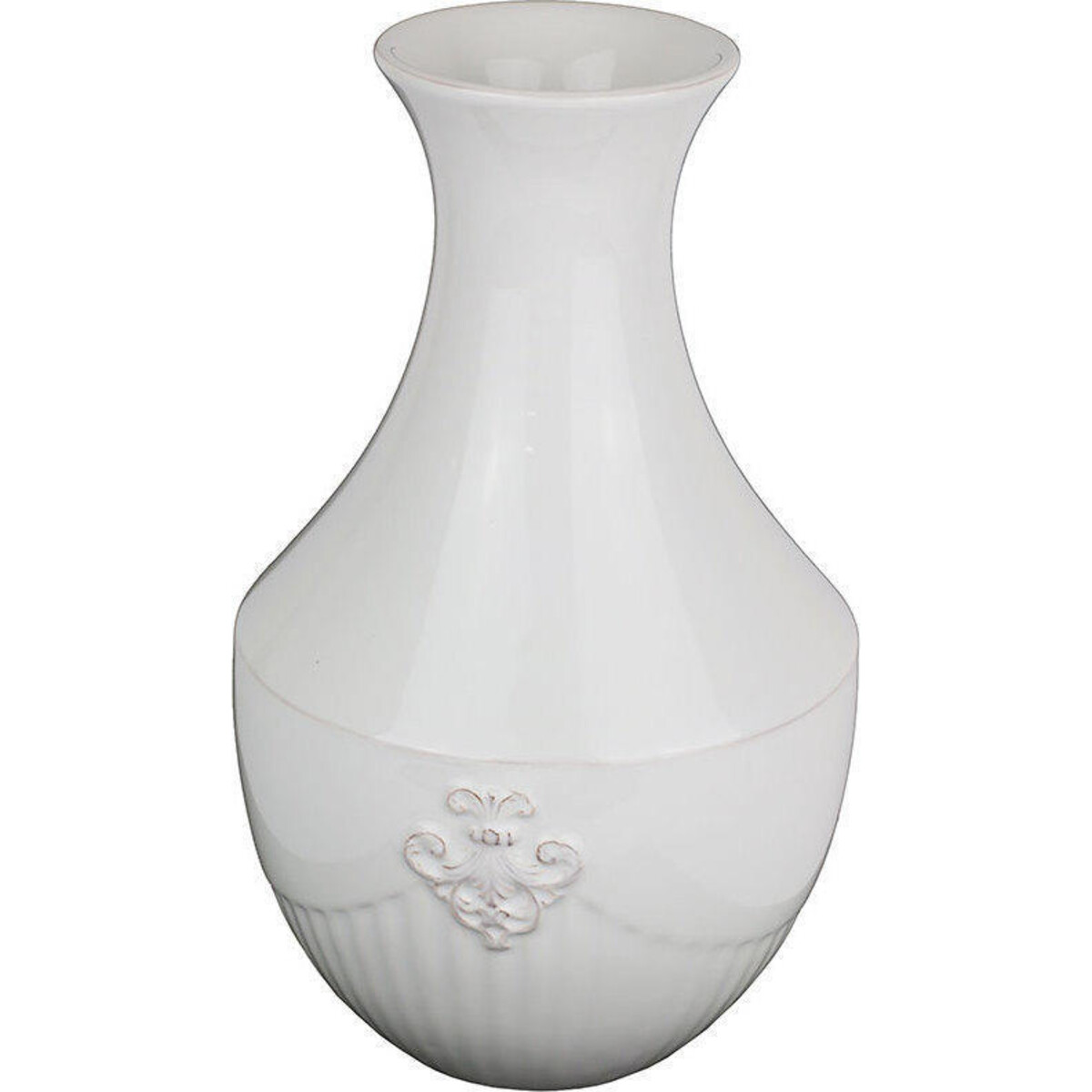 Adding tiny little accents where they are needed the most to uplift the look of not just that space but also add to the thematic resonance in some way. This vase has a delicate structure with a thin elegant stemmed neck that rounds off to a gently curving base sitting as it does well balanced. The design in the archaic de lys pattern is all the subtler because of the usage of white all through which lends it is classic touch if understatement. The vase could hold a few blooms but would look its best when topped with a single bloom whose glory it can help redefine. Even without a floral addition, its simple lines white purity and a vintage design charm is hard to miss. Could grace the console, the bedside or the sideboard.