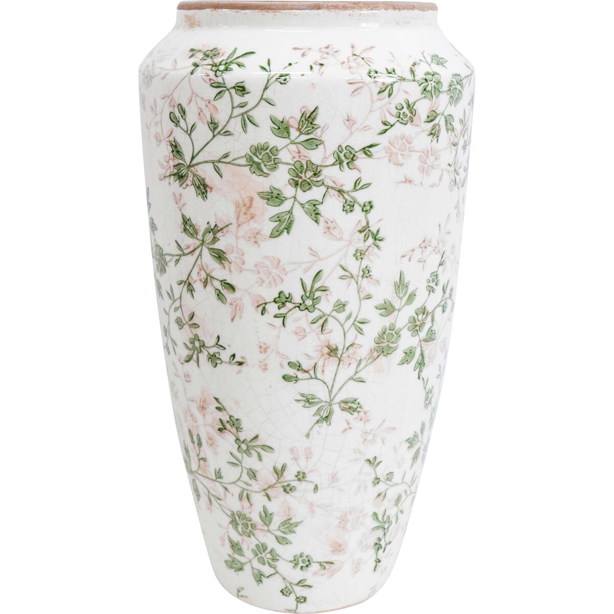 Introducing the exquisite Vase Evergreen, a stunning addition to any home or office decor that effortlessly elevates your space with its unique charm. Handcrafted from high-quality ceramic, this beautiful vase measures 17.5 x 17.5 x 37 cm, showcasing a delicate design of green and soft pink floral motifs against a pristine white backdrop. Each piece boasts its own distinctive characteristics, with variations and imperfections that only enhance its artisanal appeal.