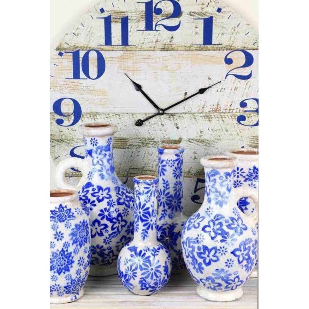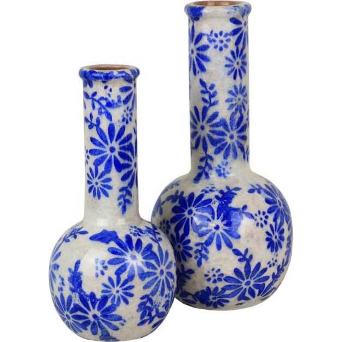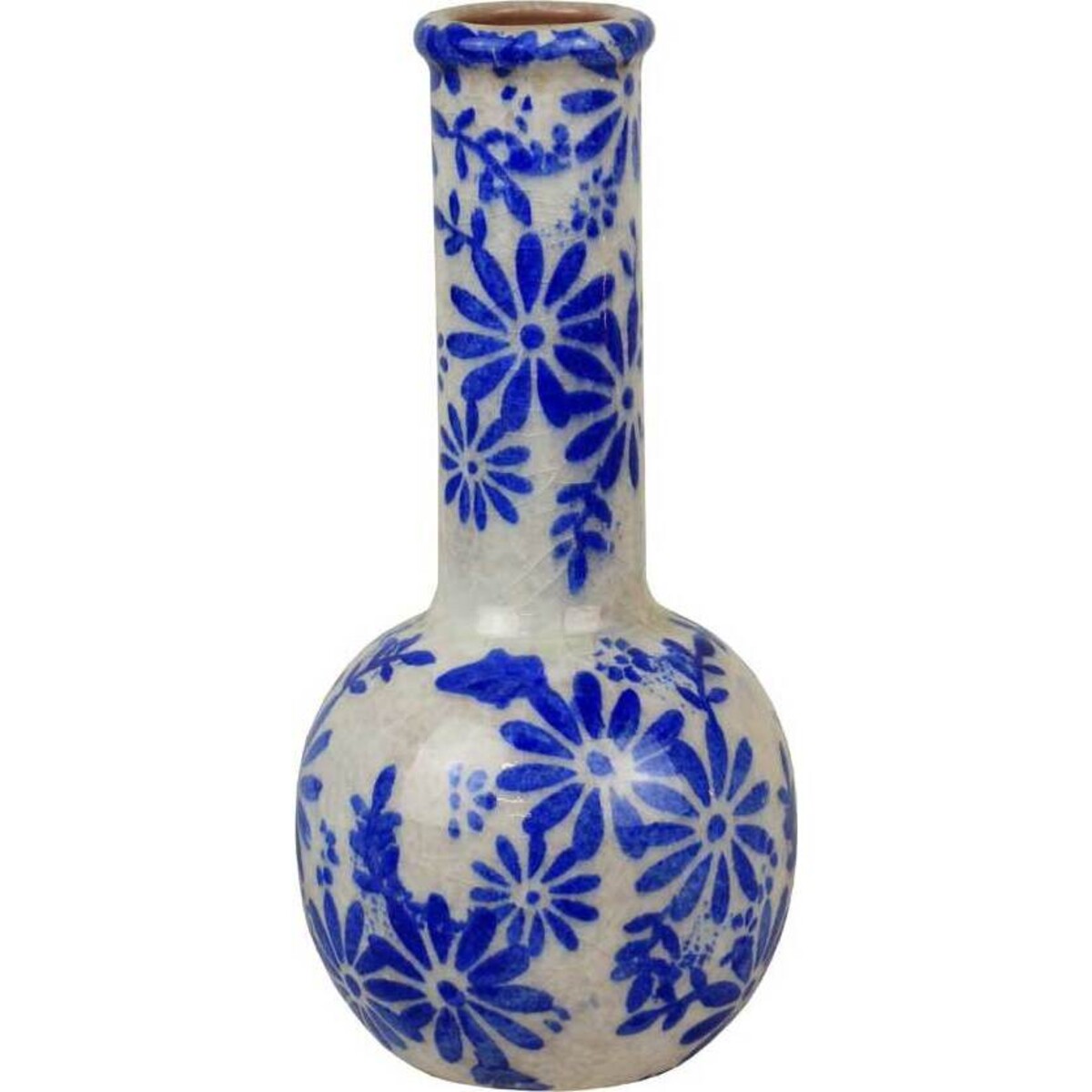 Handmade ceramic articles are a great way to enhance the decor in simple sort of way and one can begin a collection of such articles to make a pretty little cluster of different sizes, shapes and design to create a corner with juts ceramic art. This hand painted vase with its longish neck and blue floral pattern will be loved by all who like things that are hand painted as they reflect a distinct personality. This vase is about 24 cm tall and the vase has long neck and the bottom has round shape. The vase is most suited for holding a single stem flower or for making a cluster of different kinds of vases and jugs made of ceramic. It has a rustic and simple appeal that can lend easy styling to any home. The ceramic ware has smooth surface and the colour of the base shows expert handling of the glazing. Go ahead and use it to display a single stem flower or as a standalone vase which will gather a lot of attention because of its vivid blue design.