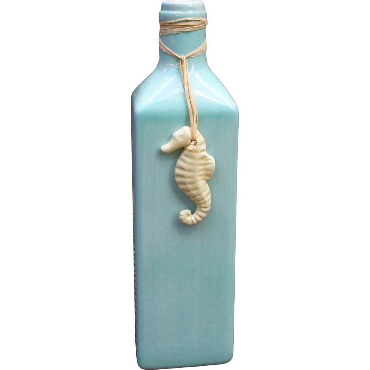This light blue vase features a rectangle body and a piece of raffia attached to the slender neck. For the finishing touch, an off-white seahorse dangles from the raffia. While this piece is lovely to display as is, you can also use it for its intended purpose and fill it with a small bouquet of flowers, preferably those in shades of blue and white to complement the vase itself.