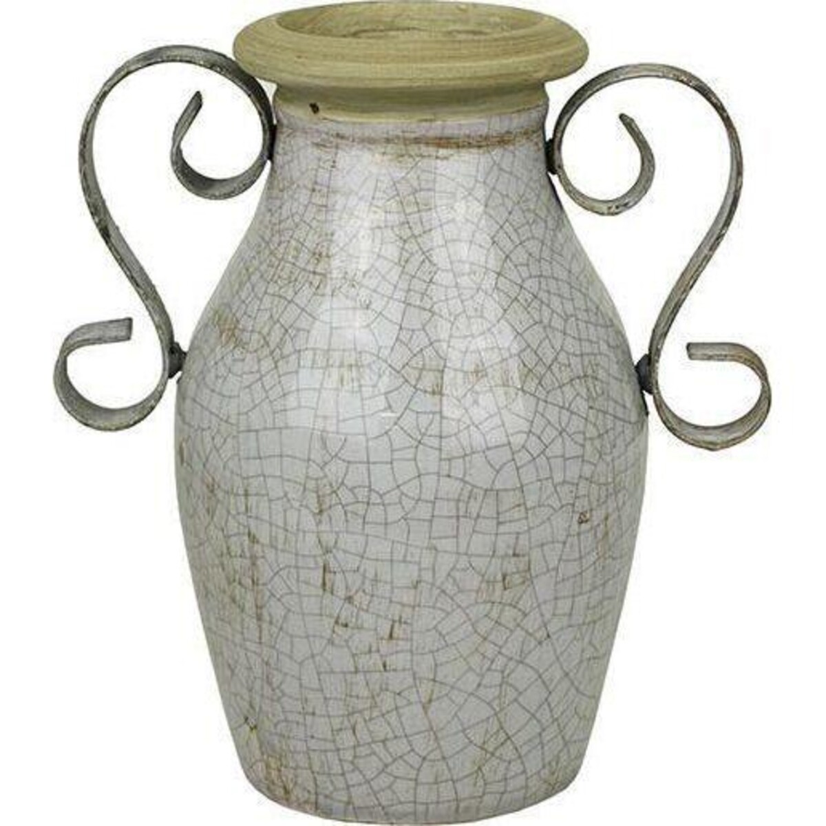 Add the class and simple sophistication that comes with the usage of ceramic in your home. They have a simple feel about them and when treated by expert craftsmen, it can be made to look rather interesting with a crackled effect on its surface - as in this case metal handles have been added that further makes its antique look more intense. The appeal of the vase also lies in its ivory colour in which the glaze as well as the cracks seem to get further highlighted. An artisanal quality vase that can be used as much for displaying spring blooms as for a simple display along with other ceramic ware. The vase bears the typical marks of handmade earthenware that makes it gain a personality its own. Placed in corners and in displays by the window it will lend the space so much class, a fresh country feel and a vintage appeal. One could pair it up with the larger version of the same design for a groups display. This vase stands 21 cm tall, and has a maximum width of 18 cm at its middle and its tapers towards its mouth and its base.
