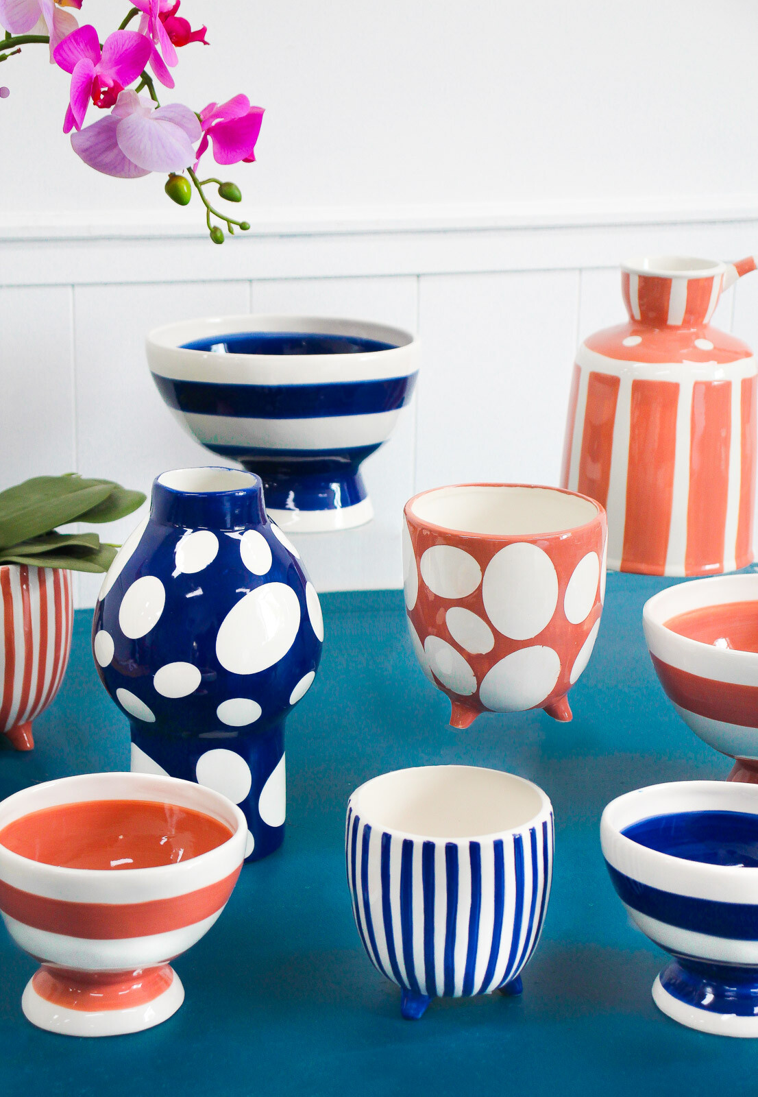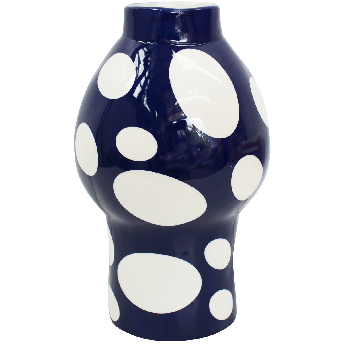 It will grace any table with its completely unique looks the white and Prussian blue colours livening up the space with its freshness. The large white spots look brilliant and striking set against the Prussian blue backdrop which also helps sow off the glaze on the ceramic body. The colours are deep and intense and handprinted. The vase will hold fresh flowers from your garden and help make any table top or mantel look its best. The shape in itself will draw attention as will the bright colours. One of this table top accessories that always help build a great look. Will wipe clean with a damp cloth brightening up its look immediately.