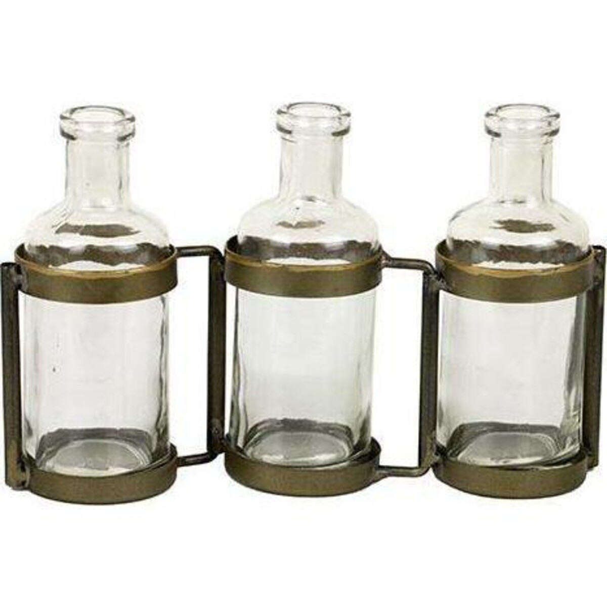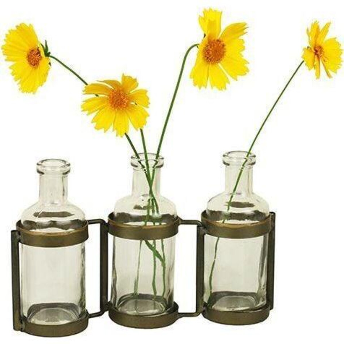 Made from a combination of metal and glass gives the Vertro design a lot more than ordinary vase - like features. The fusing of three vases has been done with the help of a frame that has spaces for three glass vases lined up one next to the other. The completely contemporary styling has undertones of antiquity lent to it of course by the metallic colours that makes up the frame of the tiny vases. All of 22 cm in length and 8 cm in height, the tiny bottle like vases are great for displaying single stem flowers and one could either make a quirky statement using the same flower in all three bottles or different ones. There is so much one can do with a design as distinctive as this. Could be displayed on table tops, the window sill, corners, or even the dining table as centrepiece. Alternate it with flowers or place in one a long tapering candle - you could be experimental in usage as well. Add more flourish to your style in any spot of your home with a vase this unique.