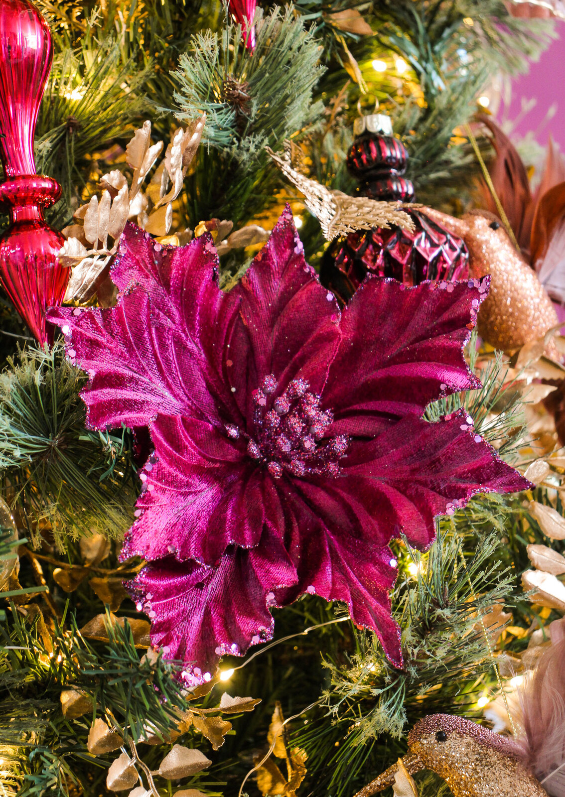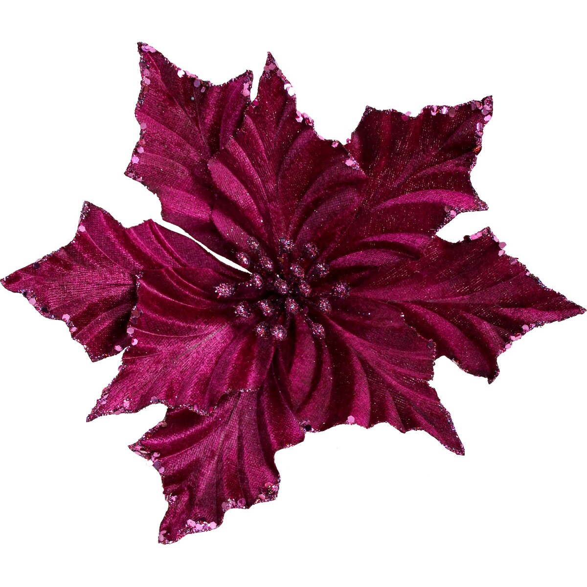 The wired petals are sturdy enough to hold their shape wherever customers want them perched. A little push or pull at the base fluffs things up instantly and makes these look even fuller. The modern berry colour is honestly quite versatile when it comes to styling. We love them massed as Christmas centrepieces, clustered around candles, or tucked into tree branches for some unexpected drama.