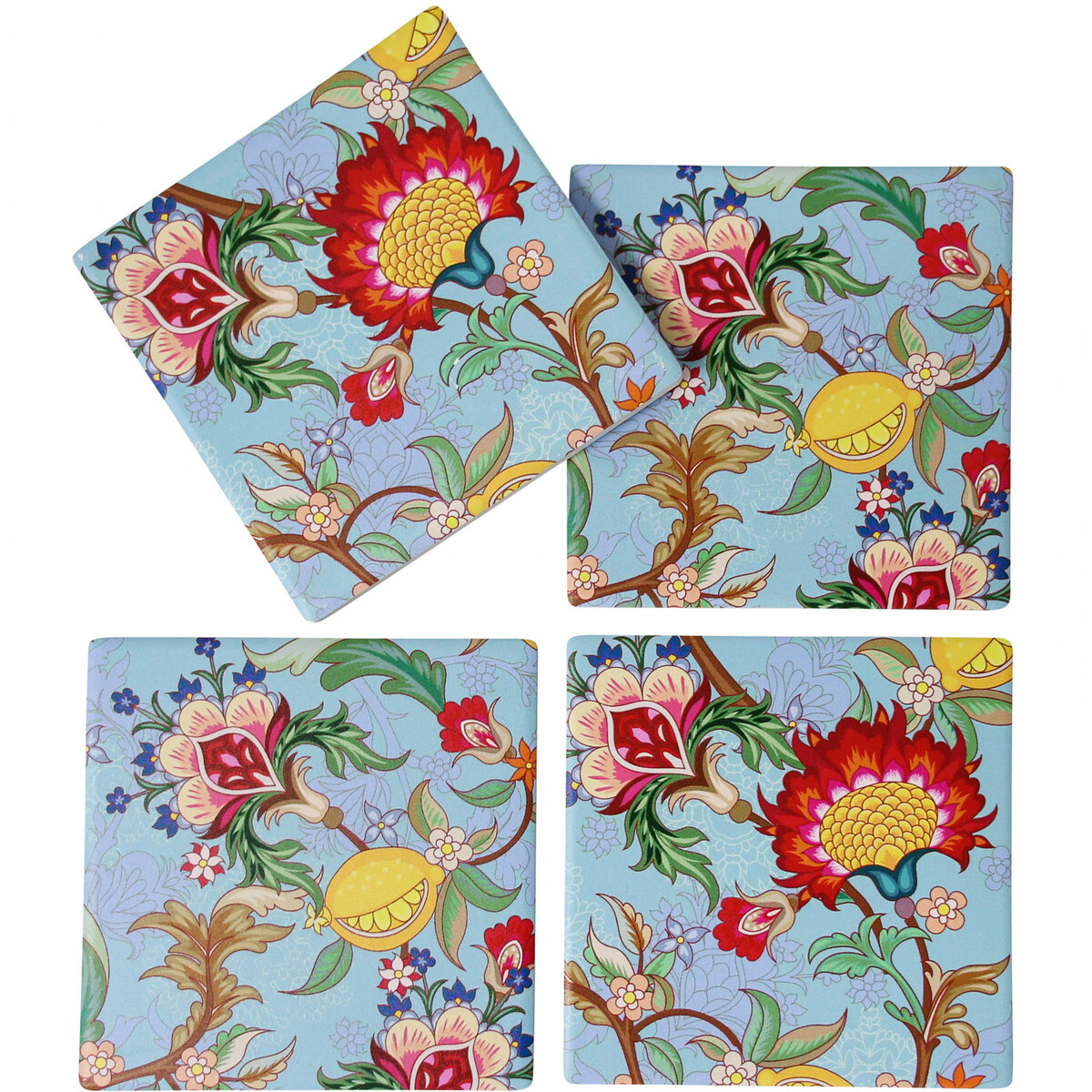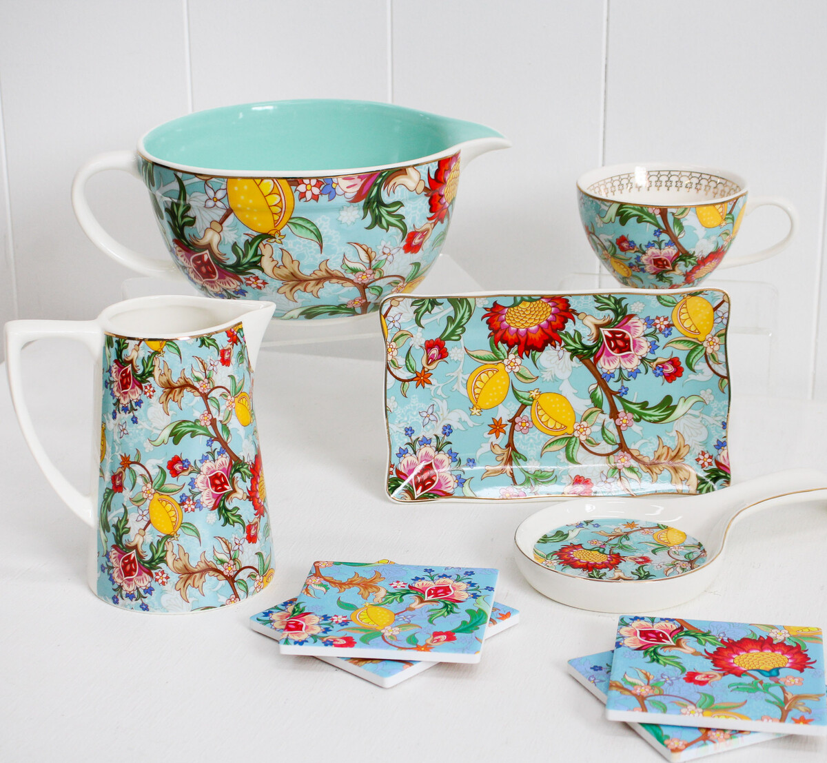The Vintage Lemon Package is a gorgeous ceramic product package made exclusively available for you. All products within this package are enchantingly glazed and ornamented with bright and colourful lemon and floral motif. The package contains 2 sets of measuring cups with each set having four measuring cups of different sizes. Also contained are 2 mixing jugs, six standard cups, four serving spoons, six square shaped plates, 2 tall jugs, 2 teapots, and 4 sets of lemon coasters.