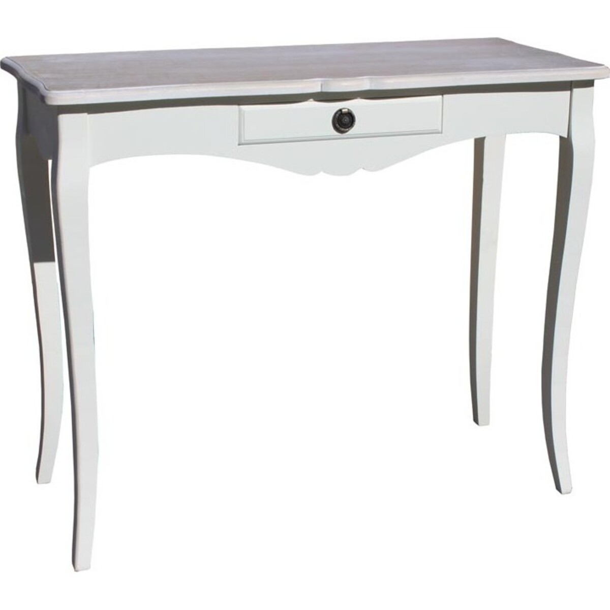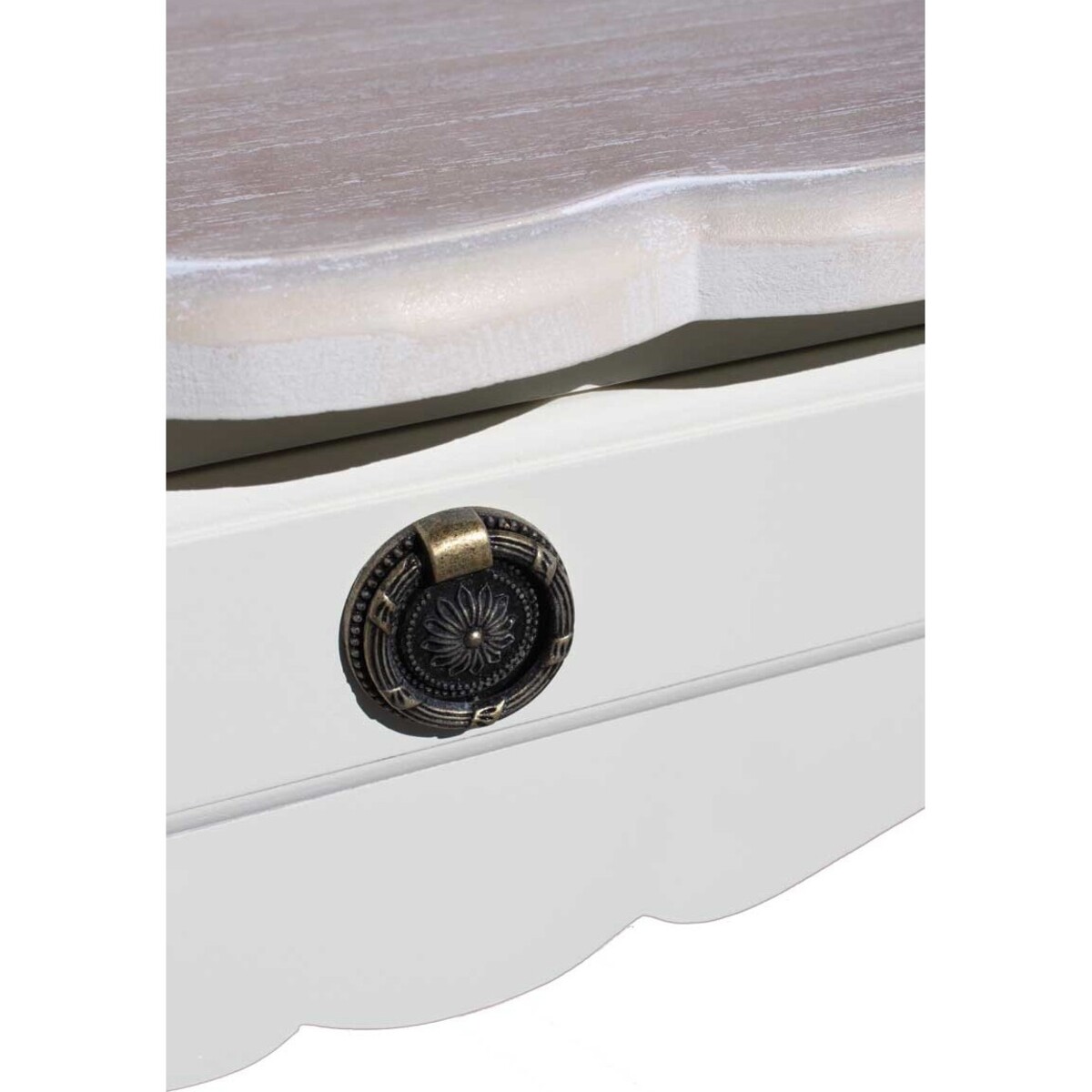 The pure white surface adds a contemporary feel and the antique finish surface gives it a patina of timelessness. The slim elongated legs give the illusion of height and add to the aesthetic appeal. The carving is exquisite and flawless. The vintage metal drawer handle is eye catching and is an interesting detail.