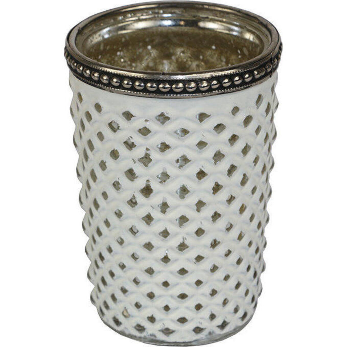 Lighting does play an important role in defining your interiors and when the look can be changed with one small inclusion, then the effort is so much lesser. Here is a tumbler shaped 10 cm tall votive that can hold a tiny tea light that will liven up the look of the space effortlessly. The faceted diamond cut design is well defined because of the usage of white colour wash. The design in itself is an amalgam of looks and patterns from several cultures and thus is suited for any kind of home. And the best part about votives is that they suit any space - be it traditional or modern. This glass votive has a metal rim that glows in the dark and gives more definition to the design on the exterior of the glass structure. The placement of such votives can be worked out as you could have it going solo or paired with other votives to create a dramatic looking clustered display. An ornate looking piece whose beauty truly comes alive when lit up from the inside.