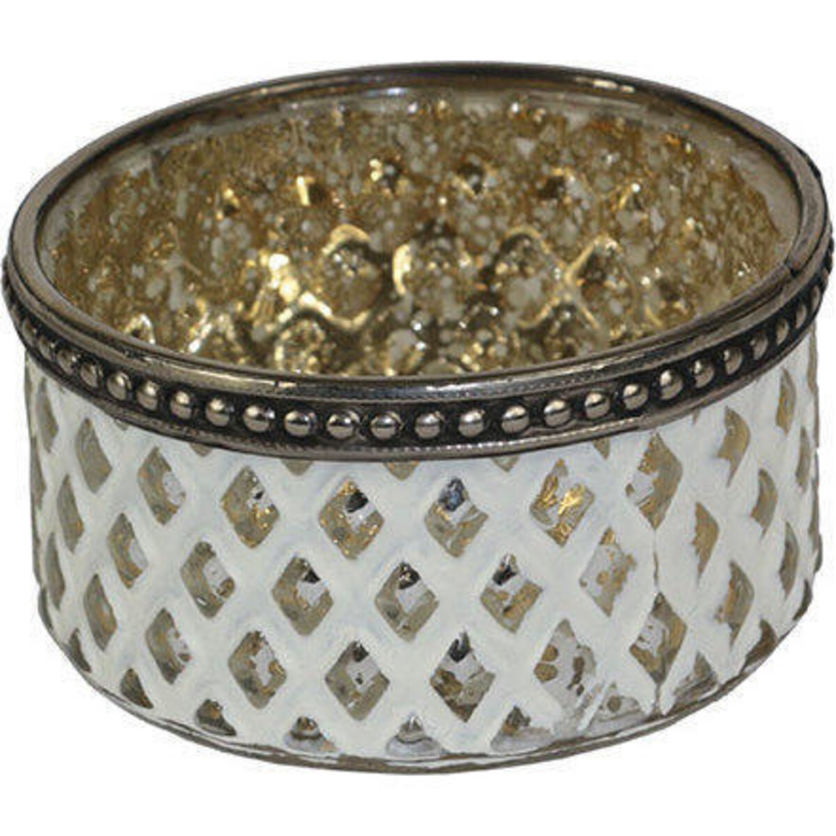 All of 5 cm in height, this tiny votive is rather broad and can hold a standard sized tealight within. The cut - glass like graceful design gets all the more interestingly pronounced because of the wash of white colour that adorns its crevices. Once illuminated the golden glow of the light creates a wonderful colour effect owing also to the golden coloured interiors of the glass structure. The shape of this votive although simple allows ample light all around the space where it is going to be placed. Use it on low tables or on mantles as well. Cab be paired with larger votives in the same design or variants of the same for an interesting display of sorts. The wonderful array of votives on offer simply proves that homes are all about creating a simple yet impactful décor statement. Made of reinforced and toughened glass, this votive will be able. to with stand the heat of the tealight. Can be cleaned easily as its opening is rather wide. Here is an option in lighting that has become one of the most popular in all kinds of decors and spaces.