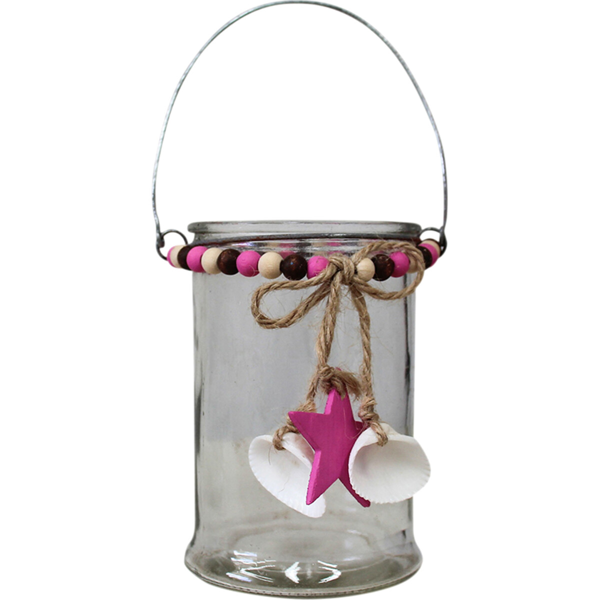 The Votive Bead/Shell Fuchsia is made of metal, glass, shell and wood. The glass is what the candle is placed in. Around the rim of the glassy candleholder is a beautiful series of colourful beads stringed together with the aid of a rope. These beads are painted in three colourful variants of white, fuchsia pink and chocolate colour. Dangling from the rope used in stringing these beads are two immaculately white seashells and a wooden star painted in fuchsia. The glass has a thin handle with which it can be around about.