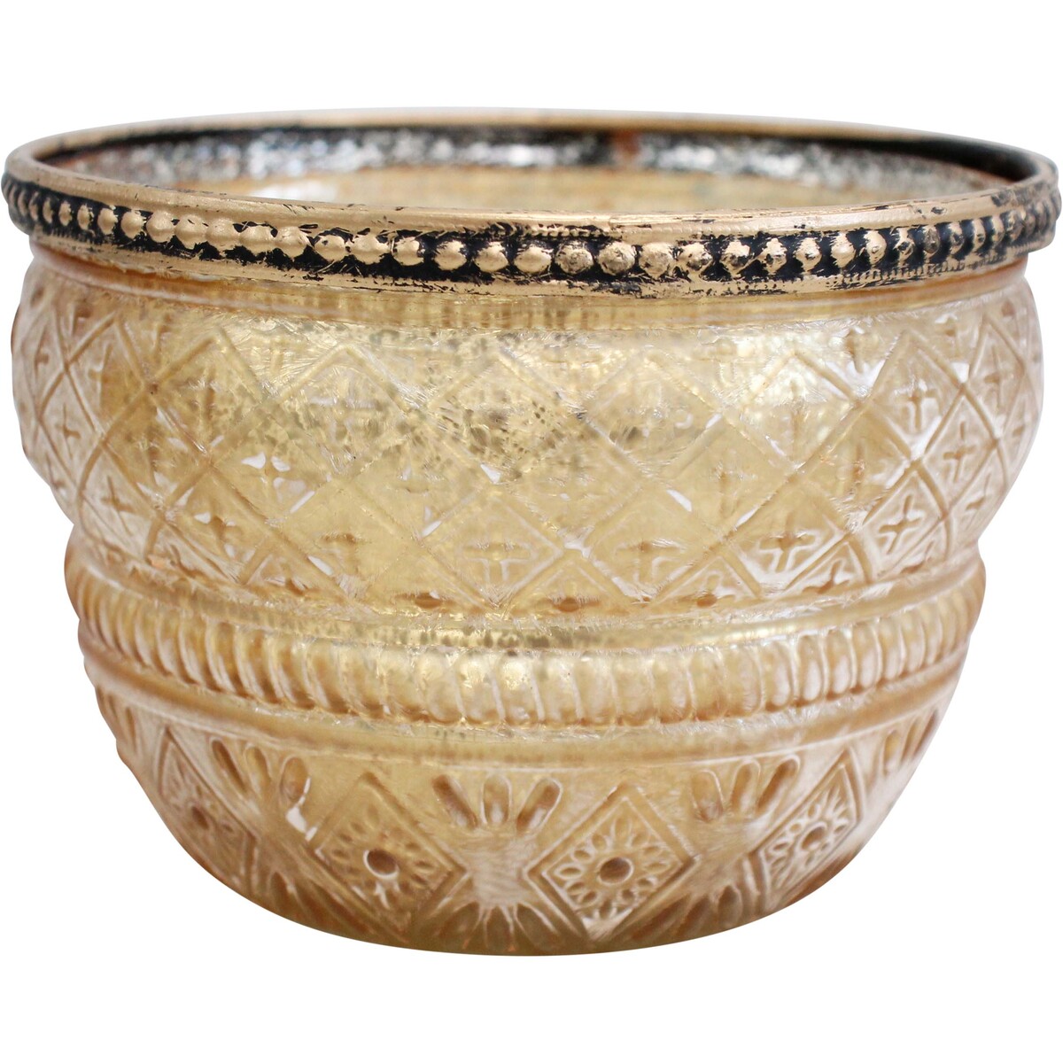 Combine the gorgeousness of fine quality glass with the golden glow of candles with this votive. Made by experts who know the significance of creating glass wear that is solid, heat resistant, shatter resistant and detailed enough to make an impact in your spaces. The votive Bowl Gold is 8.5 cm tall and wide at 12 cm diameter making it most conducive for tea lights, small pillar candles and votive candles of all kinds. The golden glow will bring alive the textured finish that richly embellishes the exterior. The top rim of the votive has a beautiful ring of copper coloured metal adding a touch of vintage finery to the look. Wide enough to clear out the candle debris, it’s the kind of votive you would love to have around when the evenings need to be intimate.
