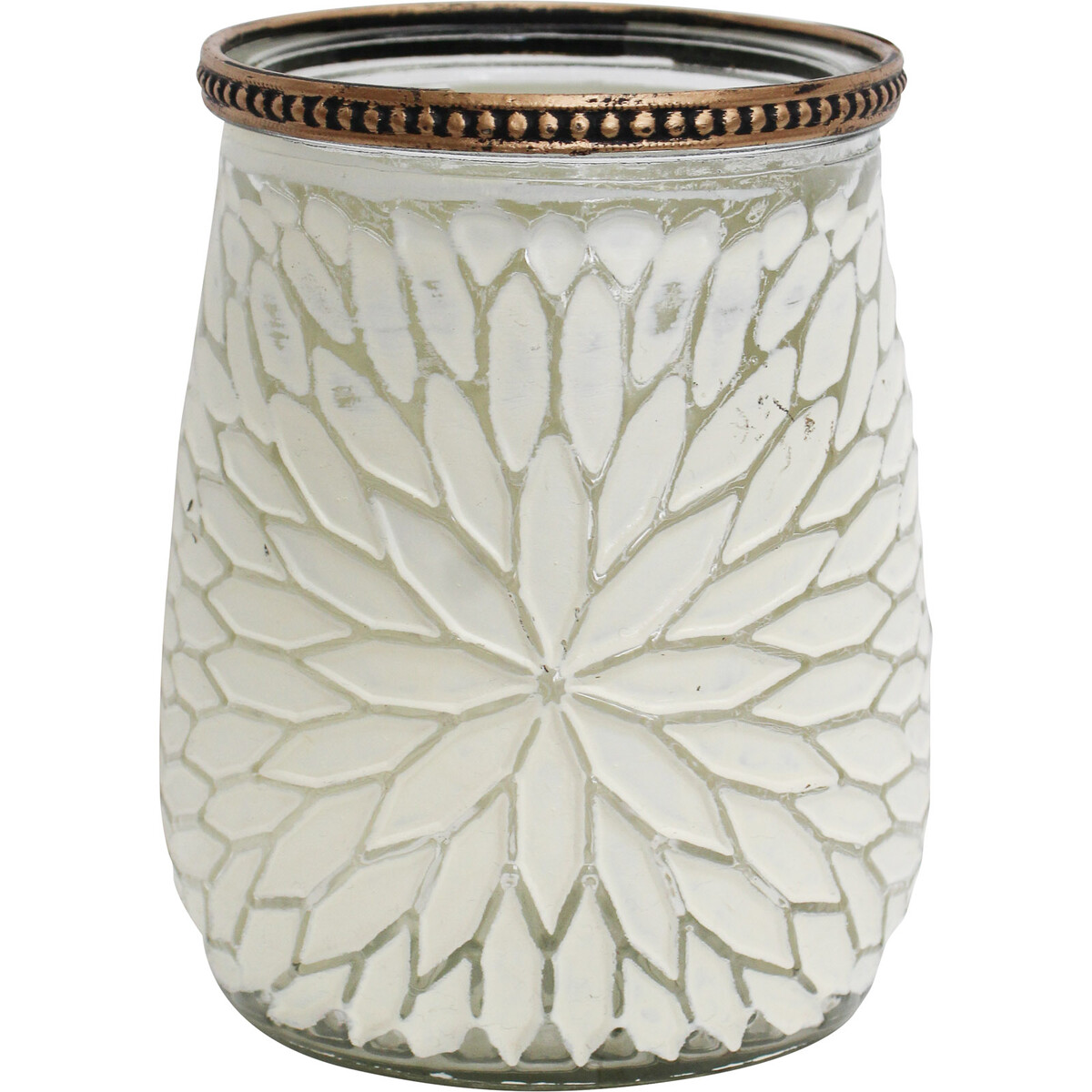 Featuring an Intriguing burst pattern, distressed white paint, and an antique metal rim. Its intriguing metal rim amplifies a metallic touch on one's shelves, mantel, and countertops. Likewise, you can position this glam on the coffee table, or console and see its enchantment play out. Its rounded glass design has a flat bottom, to prevent the candle holder from toppling over. Use it in indoor and outdoor spaces to deter candle-melting wax from dripping all over the place.