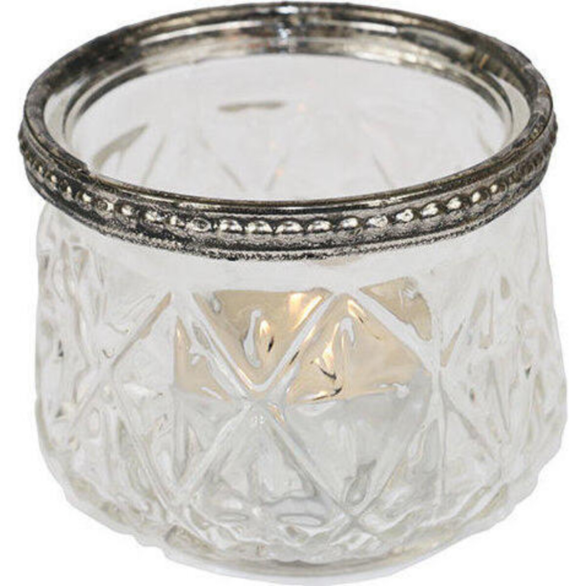 Make way for more votive in your interiors as they are great for building a look of class and elegance and certain amount of romance that comes from soft lighting This gorgeously created glass votive has a lovely cut glass pattern reminiscent of the lead crystal style glass. The glittering metal rim forms a definition for the design as well as the shape of the round drum like votive. It is all of 8 cm high and 7 cm in diameter. Could be used on the dinner table or be placed along with other votive in the corner thus adding a charming look to your interiors. The size of the votive will allow placing a tealight as well as placing of a small pillar candle. It will be easy to clean up the wax residue inside as the mouth is wide enough to allow that. Add this to your décor and make a large difference using a small lighting accent.