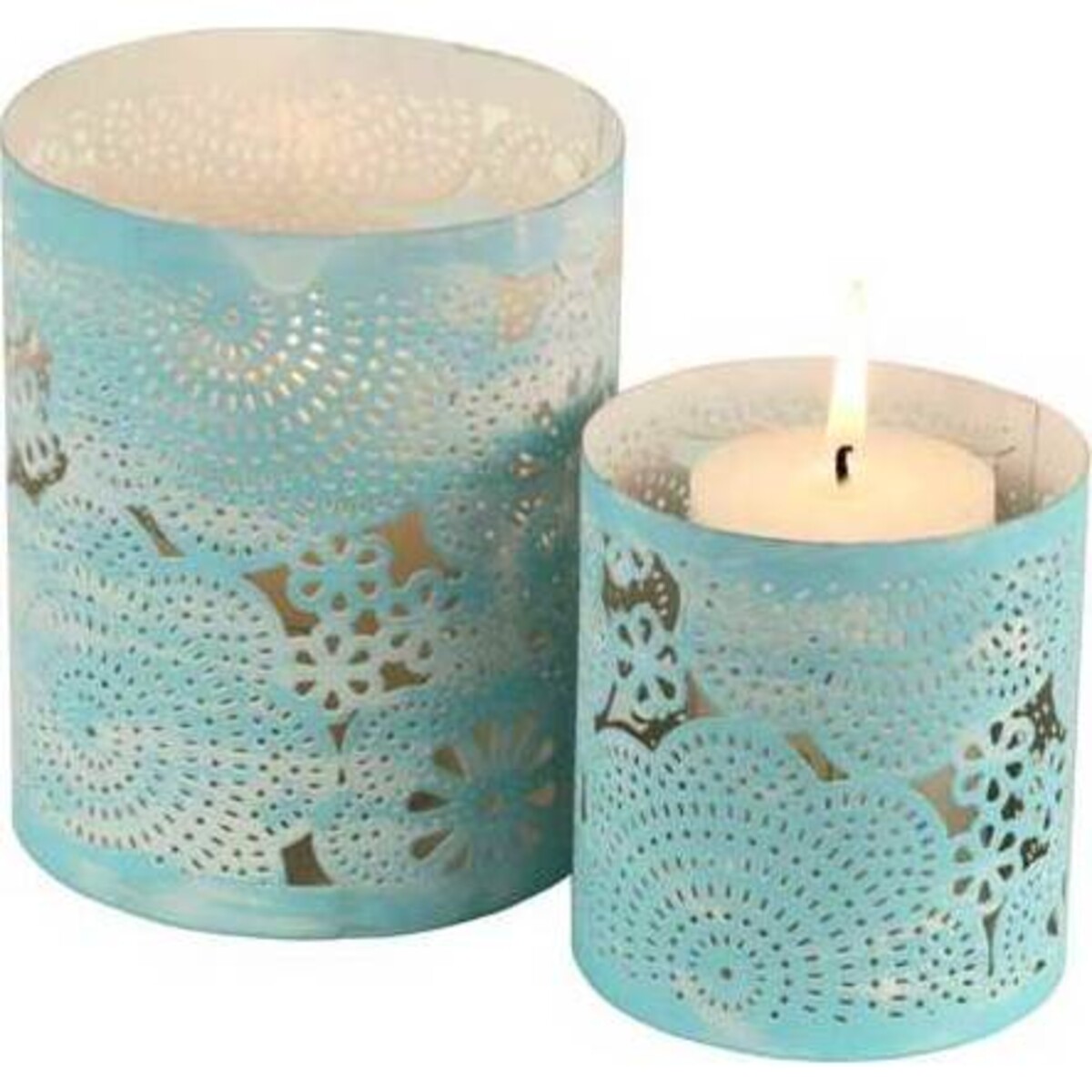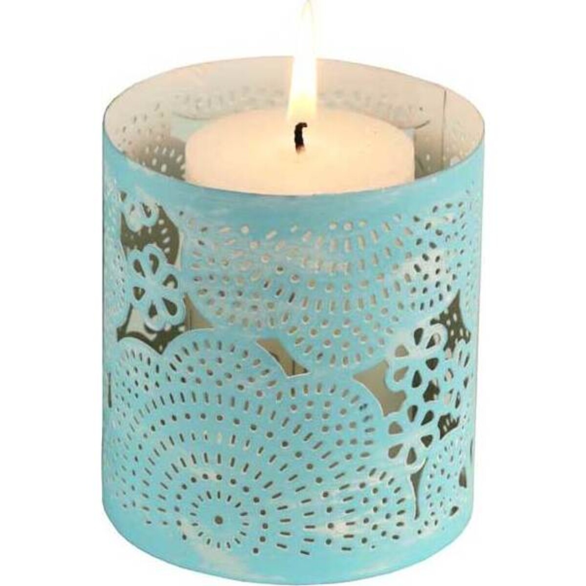 Votives that come with any cutwork design instantly raises the bar when it comes to their effect on lighting as in the case of this small little piece that has a gorgeous floral pattern. When a candle is placed in it and lit the light will fall out in a certain design that will be simply breathtaking in its beauty. This tiny little votive possess a certain antique quality, has been crafted with care out of metal and given a lovely smooth finish. The inside colour is white and the outside is a brushed light blue almost the colour of summer skies. Will look as pleasing in its unlit state as when it is lit up. A great way to do up a mantelshelf, corner, bedside or the main table. Will look fabulous with the rest of the decor highlighting their beauty with its own. A simple addition that can create maximum effect - this candle holder has a height of about 9 cm and has a body diameter of 8 cm.