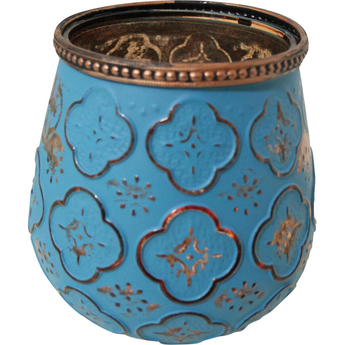 Made from sturdy quality glass, this votive is a such a delightful means to help make your table tops or corner sight up with a warm kind of glow. Apart from that, its Moroccan looks, the fact that it bears a deep and interesting shade of blue adds to its most interesting kind of presence. Th specks of gold and the blue colour collude in the most distinct of ways to give an impression of the mid-east once lit, the pattern on the outer body of the votive will be even more visible clearly. The glow of light of course will be diffused and f sot-such mellow kind of lighting helps make even the dullest of spots in your interiors light up with a beauty its own. has a soft curving base and a top that is rimed with a metal ring adding to its charming looks. Yu could place it in singles or use them in pairs with votives hanging above or more such table tops ones to give your interiors or exterior lighting whole new flavour.