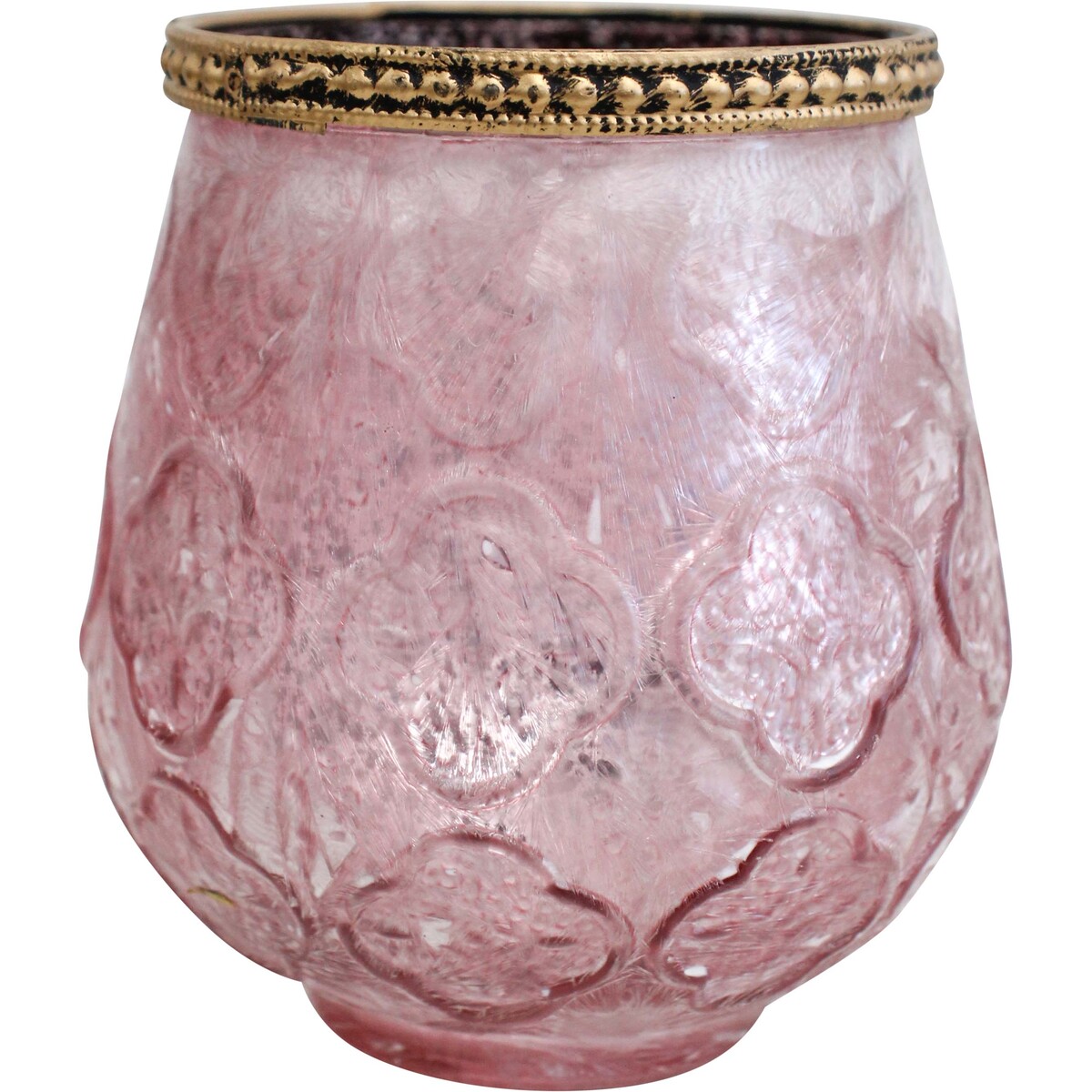 All of 11 cm in height and completely textured with a partly opaque body-the glass is strong and sturdy enough to handle the heat from candles. The gold coloured metal rim adds the touch of glitz and glamour to its pretty textured look. Will easily hold a small sized pillar candle or a tea light. For your spa like space-switch to inserting an aroma candle instead. The glow of the candle from within makes the pink colour turn to a gorgeous warm terracotta colour. Add more votives of this nature to make that your spaces look more boho chic and utterly inviting.