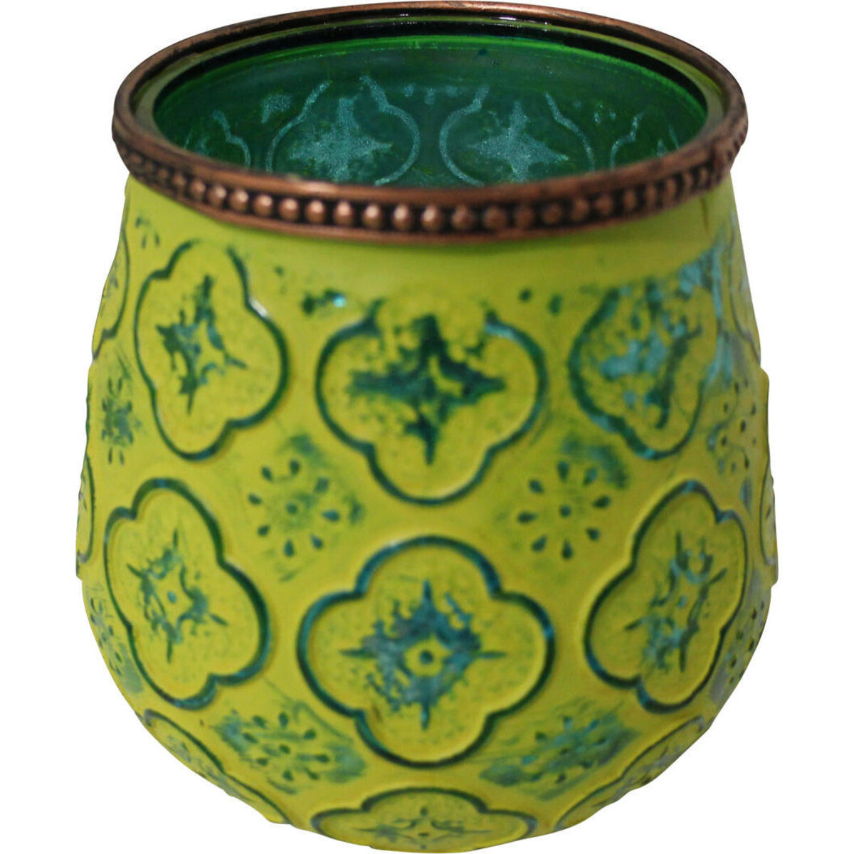This lighting accent is entirely hand - painted in yellow with exquisite details all over the glass body and a copper coloured metal rim. Since it is handcrafted, there might be slight irregularities and colour variations which are inherent in handcrafted products. These should not be considered flaws and viewed as part of its natural look and charm. The quatrefoil details are highlighted as the candle is lit in the darkness creating a wonderful peek - a - boo effect for this metal and glass candleholder. It can hold a pillar candle, fairy light, tealight or a steep candle and you may add any of these once the original candle is used up.
