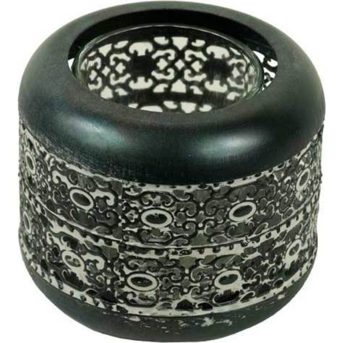 The delicate play of light and shadow shining through the filigreed wall so a tiny votive can do great things for a special setting and with this piece form Lavida one cannot really go too wrong. The black metal French design votive will add that tiny accent to the setting and make quite a dramatic difference.