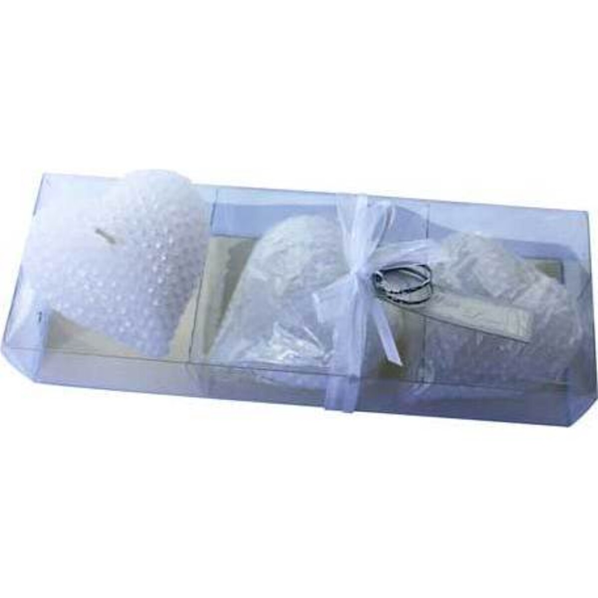 Introducing the set of 3 Heart Pearl Votives. Each white heart shaped candle is covered in little faux pearls for a stunning look you can't pass up. All three are placed in a sectioned plastic box and wrapped with a white ribbon for an added elegant touch. They're lovely enough to display as is or to put in a bowl of water for an incredible centerpiece. Whether you keep them for yourself or give them as a gift, they're going to look stunning in any home.