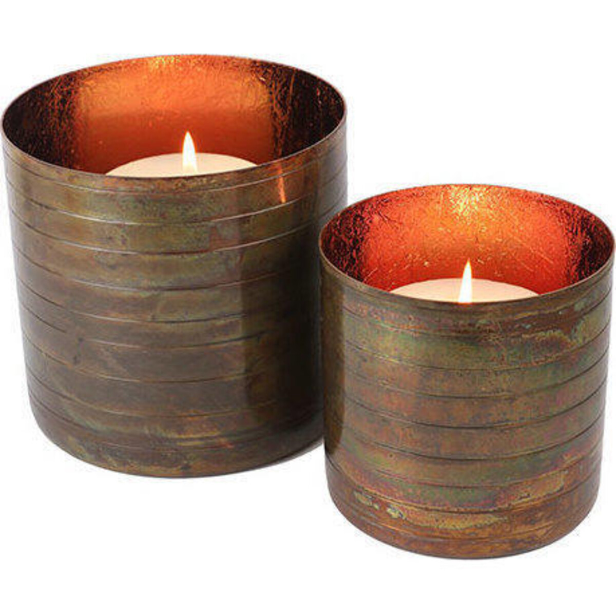 Votives are a great way to build in not just a charming spectacle of light but add so much charisma to the way even the simplest of décor begins to look. Add the twinkle of lights and the shine of a lovely copper votive which comes in asset of two to take care of your ambient lighting need. Place them in any art of your room-the main dining table, or in the corner to liven up a dull space. Add it to a setting done up with flowers, or add it to the coffee table when relaxing with your coffee. Take these votives and add in them pillar candles or simply add tea lights and see the glow reach the spaces you never could imagine would looks so spectacular. Place something you would want highlighted right next to it and give it a whole new highlight. There is so much one can do with votives as great as these and when you add the magic of metal to their look, the effect is all the more enchanting! The smaller one is about 11 cm in height and the larger is 13 cm in height.