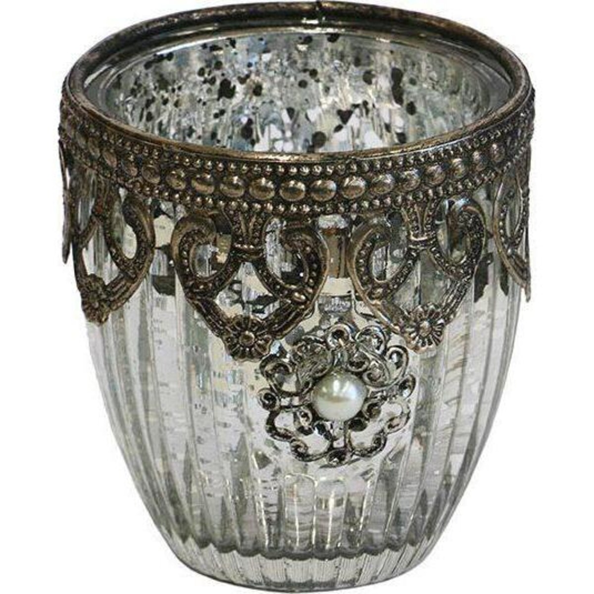 There is a lot of onus on lighting effect to change the way interiors look and when it comes to votives, their very look and positioning can make a huge difference to the way your interiors will look in the muted light. You could place this very oriental looking votive in places that you wish to highlight -maybe under an artifact or near a painting and allow its gorgeous glowing light do the rest. Made of glass and metal, its highlight of course is the medallion like necklace that the votive is wearing. Ornate and very antique in its appeal, the metalwork on it complements the ribbed design to perfection. Add several such pieces to your décor and see how wonderfully classy and oriental the feel in your décor will be. The metal design and the embedded pearl in the medallion are its absolutely gorgeous highlights. The votive is all of 8 cm in height and 7 cm in diameter making it a little narrow towards the base while its mouth is much broader making it easier for one to clean up the inside for residual wax.