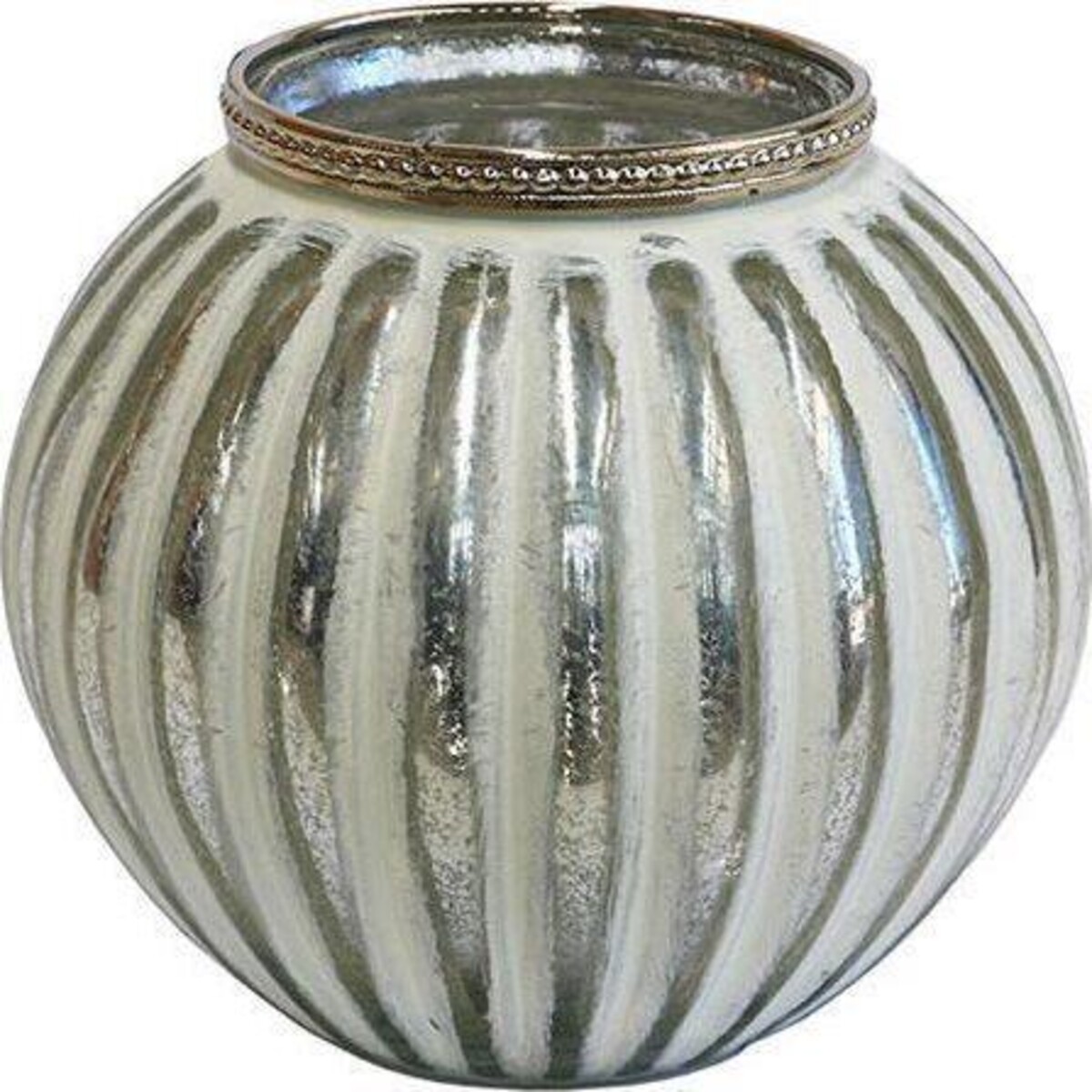 The votive Ribb Ball is about 14 cm tall and round in shape with ribbed design all over its exterior. What gives it more of a look of style is the wonderful white and gold shimmer design that adorns it. The broad white band has been created from the colour wash the pattern has been given. The light is going to filter out in a dual tone manner-somewhere gold and in places a soothing glowing silvery white. This duality makes the votive rather interesting. The diameter of the votive too makes it quite large pic end having even one of them in the corner with a large pillar candle within its recesses should be adequate for lighting up that space easily. Add more such variously sized votives from Lavida as it is in the right form of illumination that you can create a varied look for your interiors.
