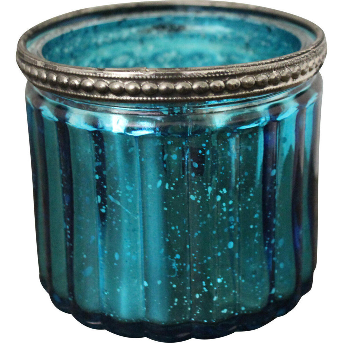 The glow of candles is soft and the lighting subtle-such an inclusion add just that hint of mellow glow that can help transform the mood and this aqua coloured ribbed bodied votive is a fine example of how you could add oodles of charm to your otherwise simple décor. Made from high grade glass tinted in blue, the rimmed in meta votive can hold a small or medium sized candle. The speckled blue body is turdy and the glass thick yet the kid that will help diffuse the light perfectly. You may use the holder to place either pillar lights or candles that are taller. The illumination from within will throw into prominence the ribbed design and the speckled colour effect infused into the glass. Be it special occasions dinners, a centrepiece or the console table that will help welcome your guests, you could add this votive ins all such places for a profound difference to its loo. The height of the piece is a mere 7.5 cm and its cylindrical body is 6.5 cm in diameter.