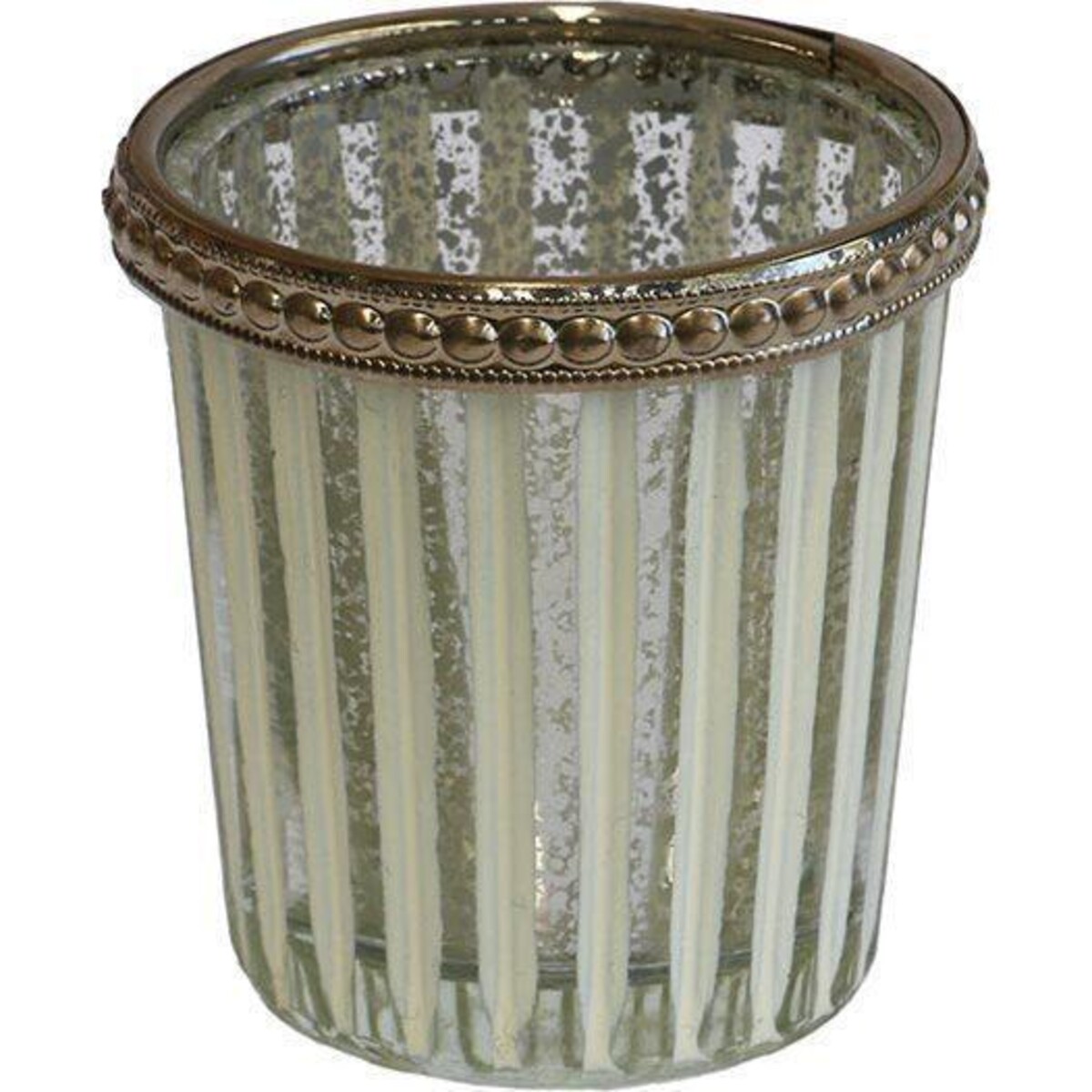 There is always something strongly romantic about candle light and the manner in which it can help enhance colours and patterns- and when the light itself emanates from something as well designed as this votive, the effect is all the more enchanting. All of 7 cm tall and with a diameter of 6 cm this slightly tapering votive is made of string thick glass which allows the light to spread in diffused kind of way owing to its own ribbed design in silver and gold into prominence. Add several of these om coffee tables, dining tables, in those dark corners where usually you are left with very little to do and make your spaces come alive in all its glory. Can be shifted around and placed wherever the party moves. The votive could hold a tea light or a pillar candle with ease. Handing will be simple even with the candle lit as the thick glass will ensure the votive is not too hot to touch. Can be cleaned with ease for wax residues.