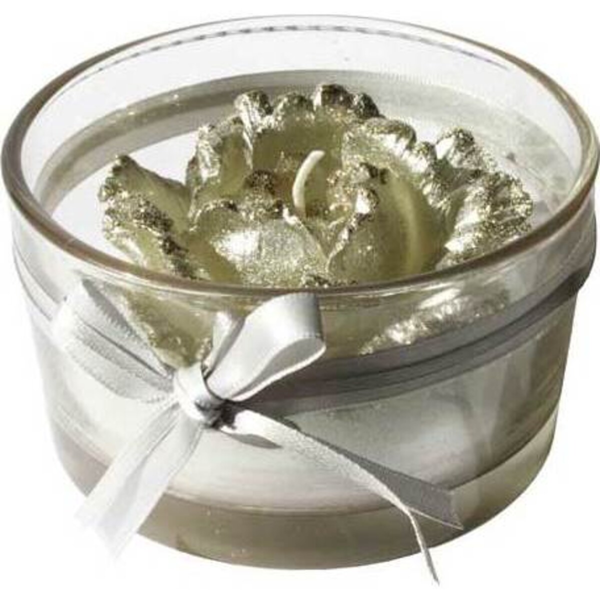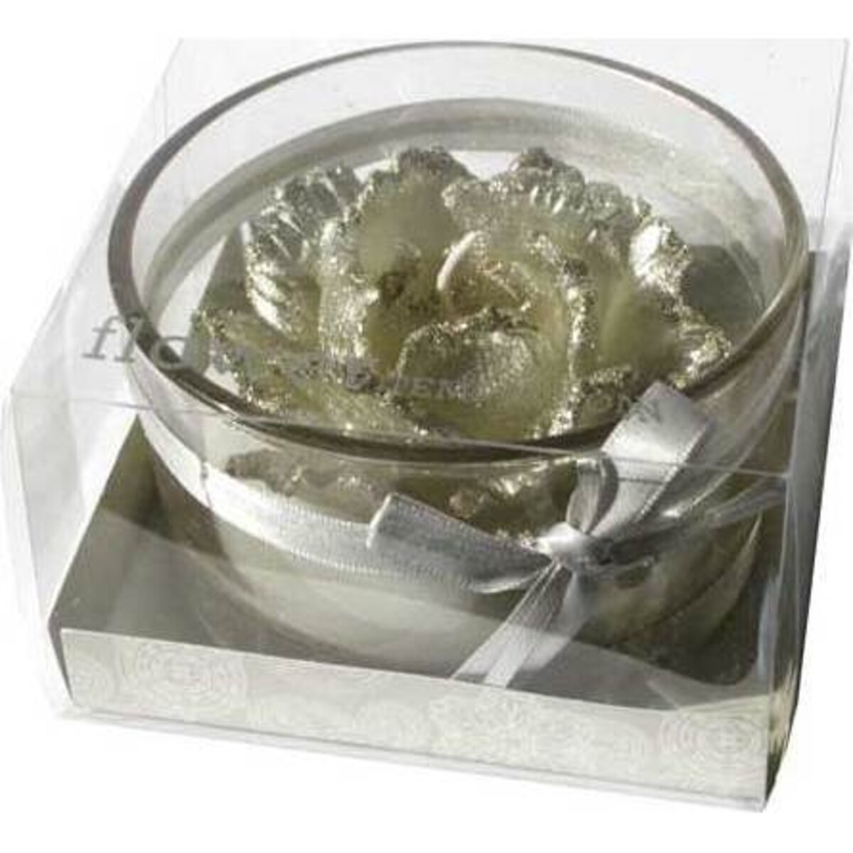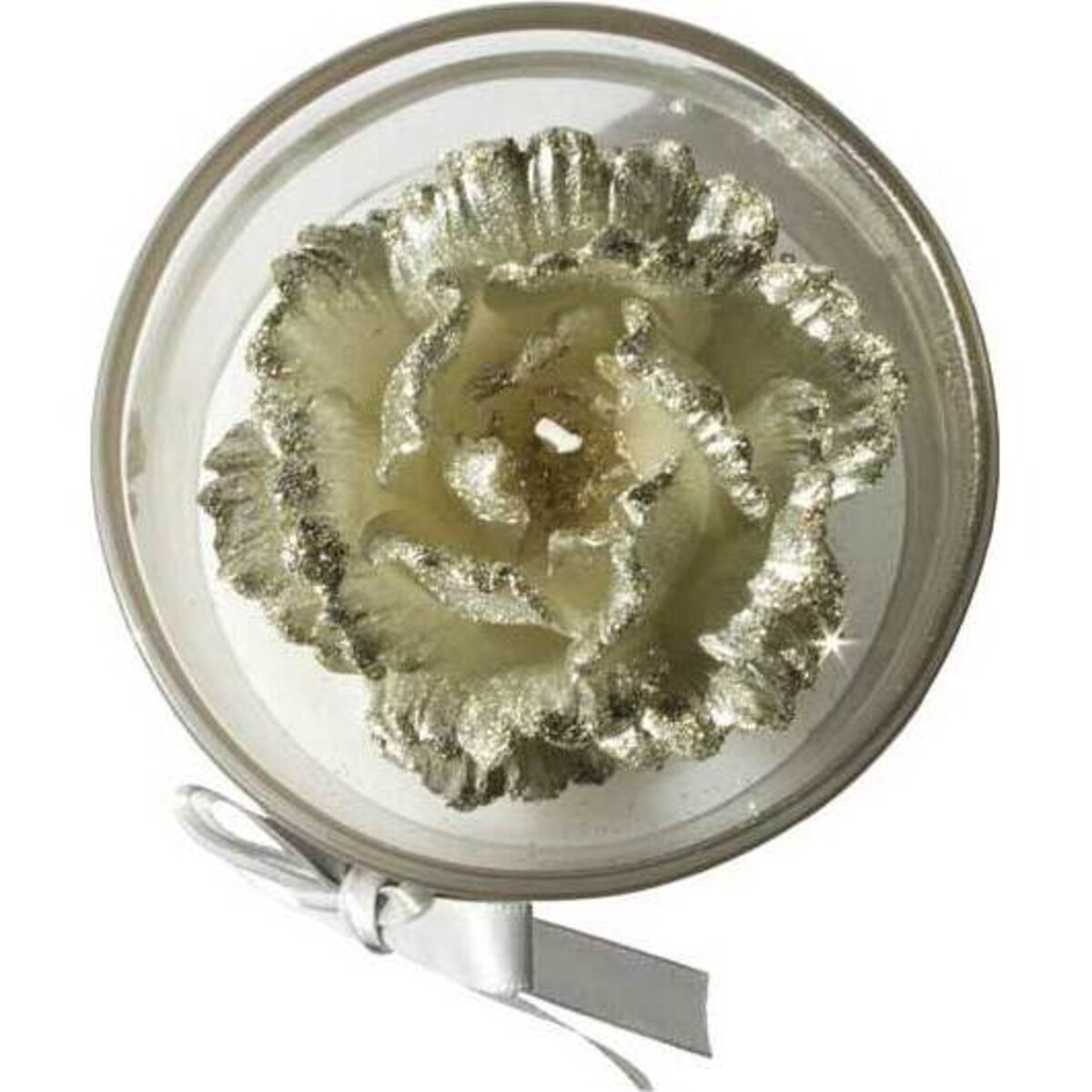 • This larger version of our Silver Rose Votive is elegantly displayed in a reusable tempered glass votive holder. • Two layers of silver and white polyester satin ribbon are tied around it into a bow at the center. • Smokeless wick stays straight throughout the entire burn. • Clean burning wax is safe for all environments. • The realistic rose shape is created using a silver "foil" finish that gives it a unique chic appeal. • Rose holds its shape as the candle beneath it burns. The contemporary design of the Silver Rose Votive is perfect for weddings and other special events, or as an accompaniment to a silver or crystal setting.