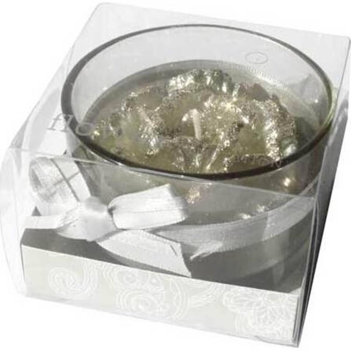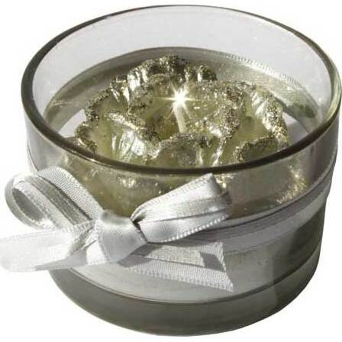 é The reusable glass container is heat tempered and presented with a double layer of white and silver polyester satin ribbon.