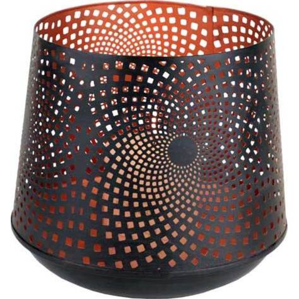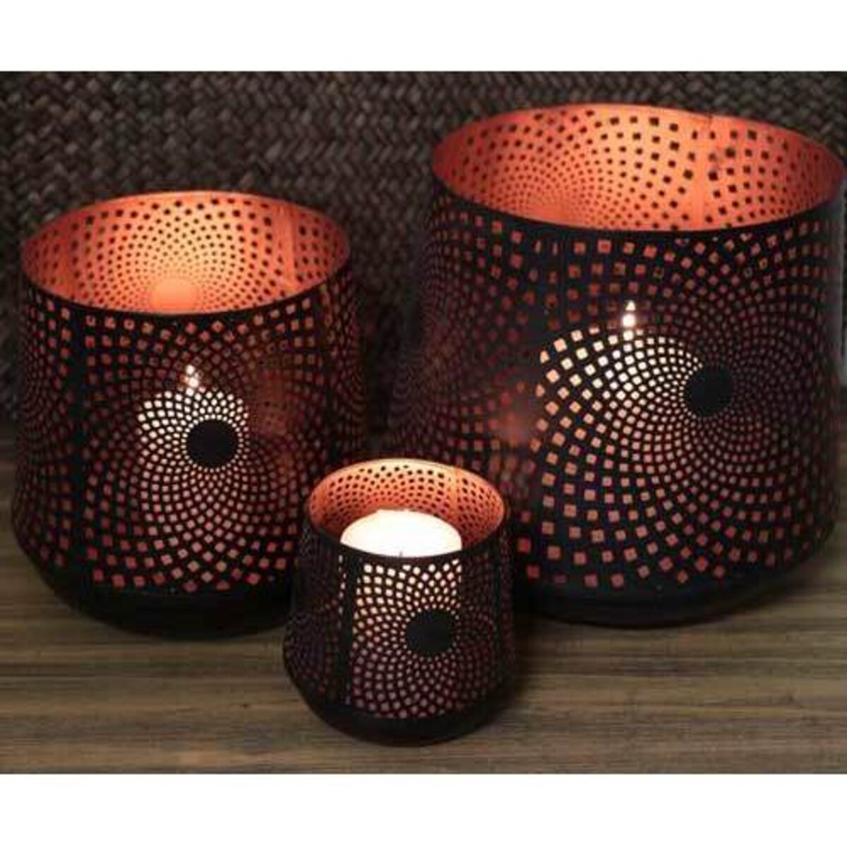 One always is in need of little home accents that give more class and personality to our interiors and votives are a great way to ensure that spaces acquire that look of class without shouting it out. This metal votive has a beautifully designed filigree pattern that rises on a black matte finished exterior and glows with an amber coloured inner surface which in itself looks gorgeous. The filigree ensures that the light will fall out in a distinct pattern giving the space an outstanding colour and mood lighting effect. About 21 cm in height, with a 17 cm diameter base and a body diameter of 19 cm makes it easy to loft and place in nay corner where one desires to bring on more light and colour effect. Masterly design and finished as usual with Lavida's uncompromising eye on quality. A lovely gift for any housewarming or special occasion.