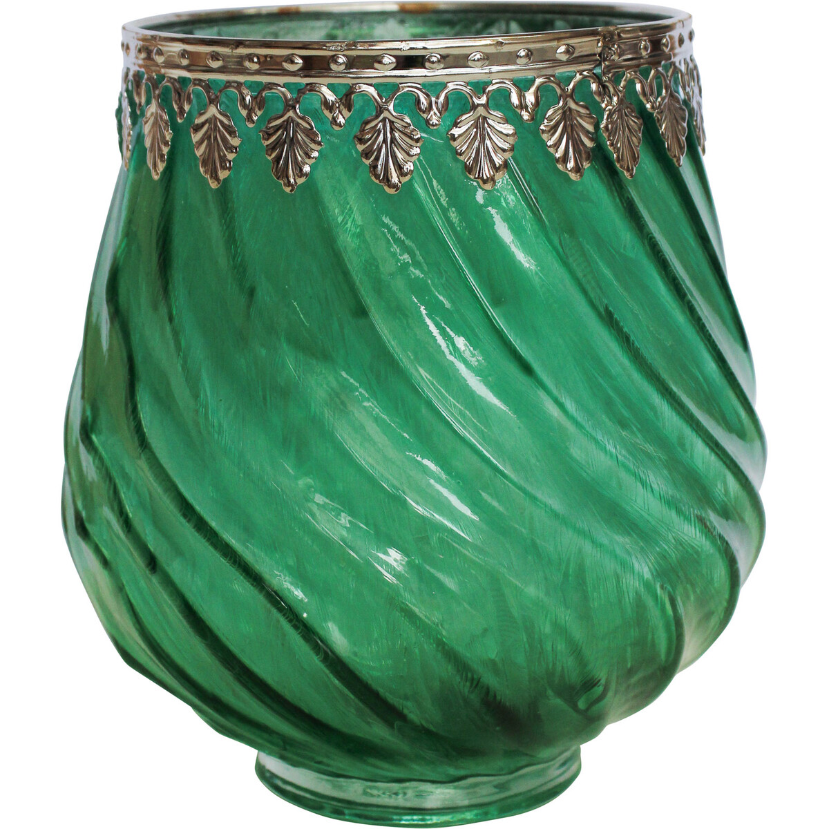 Crafted through the use of premium quality glass material, the rim of this glass votive is ornately decorated through the use of high grade metal material in a lovely patterned design. The glassy body is made in a softly curving pattern such that it looks like a swirl. What is most iconic about this votive glass is the choice of glass hue. The glass is hued in soft shade of green while the metallic ornamentation which decorates the rim is lacquered in silver colour. It is just as ornamental as it is practically functional.