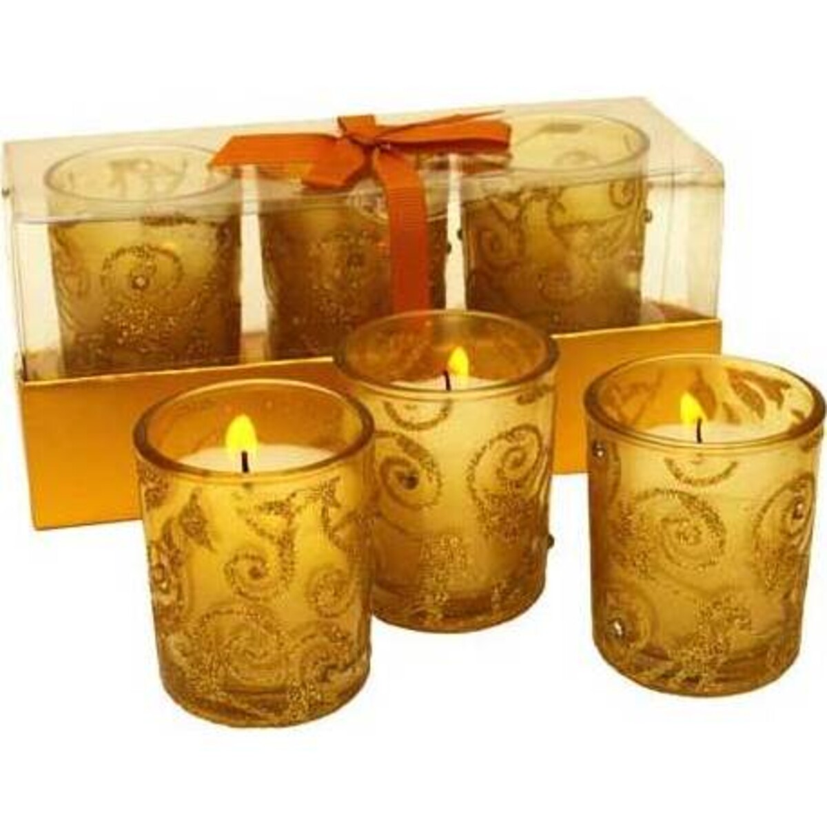 This set of three Gold Swirl Votives from Lavida can do all that and then some. Each candle comes in a gold tinted glass with gold glitter swirls that shimmer from every angle. When the flames are lit, they illuminate the candle holders beautifully. The set of three candles comes packaged all ready for gift giving in their gold and clear box that's finished off with a bow. They're ideal for weddings, surprise party, date night, and any other special occasion.