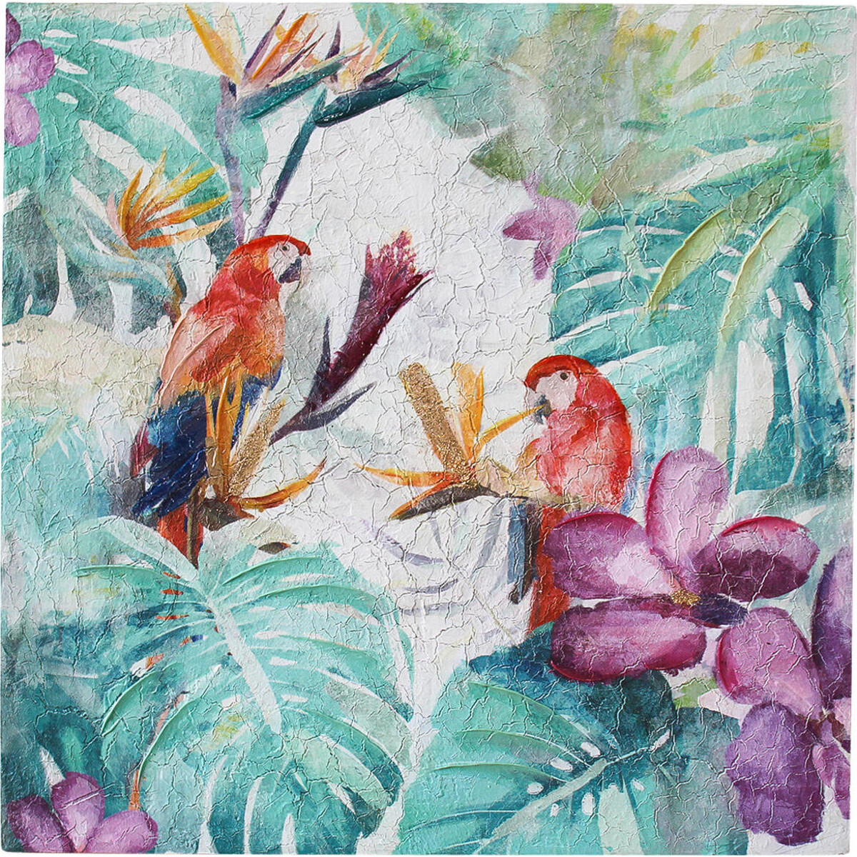 Wall Art Tropical create a relaxing haven, a creative artwork that life into empty spark walls. The flowing spring background had a steamy flair, thereby accentuating the tropical plants, purple hibiscus, and the vibrant coloured parrots to take centre stage. Guests are sure to love this piece. Its tropical aura makes it suitable for the children's room. They will adore it for years to come. Wall Art Tropical exemplifies the tropical plant life. For a chic style, use this artwork to draw attention to a piece of furniture in the living room or used it as a headboard for the bedroom.