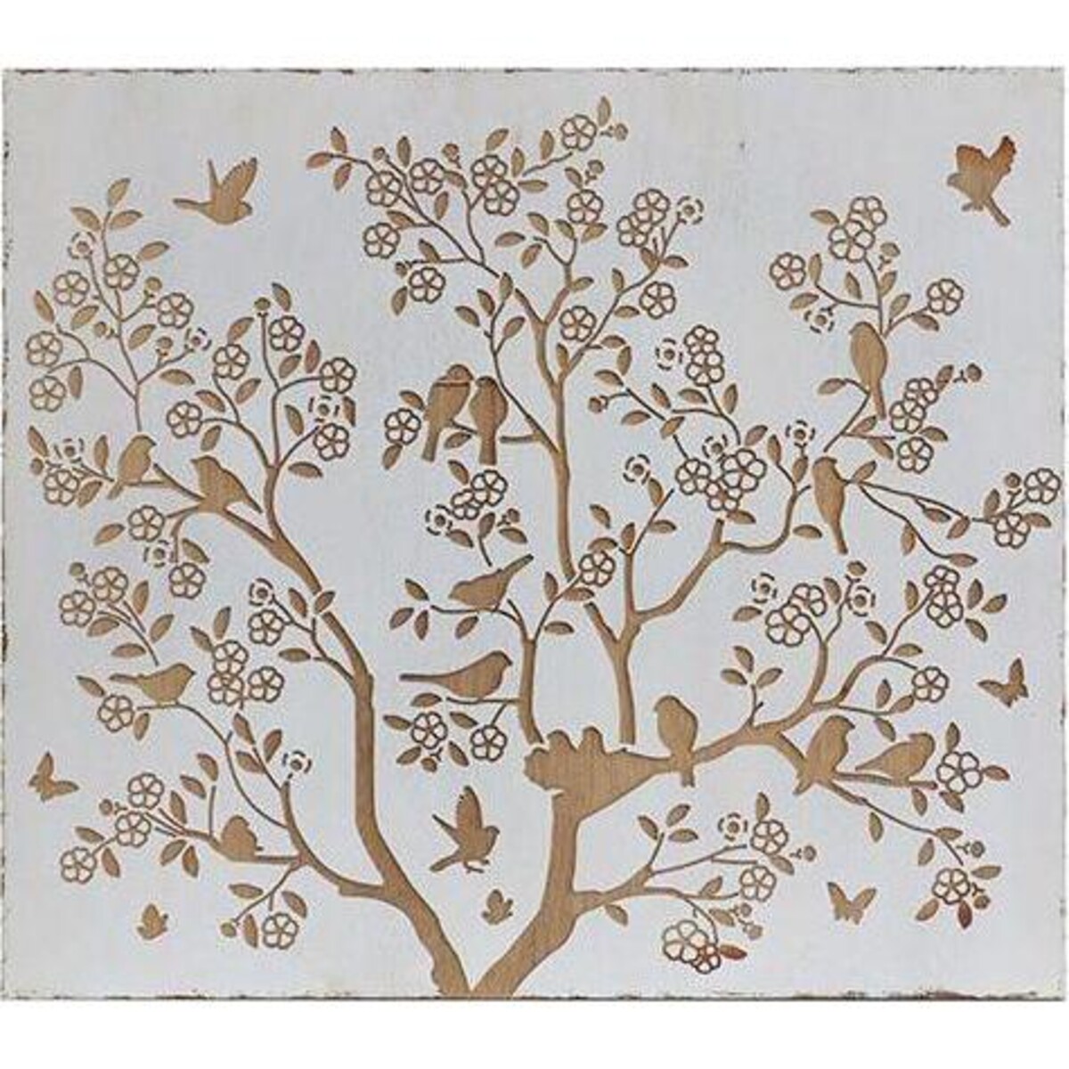 Art opens up a dimension of beauty that we can seldom perceive with our eyes open as we are always surrounded by stark truths that are seldom pleasing. Adding this gorgeous nature based artwork will allow your wall space to create a feeling of deep satisfaction that comes from having something peaceful and serene in the home. Like the sounds of faraway church bells or the first twitter of birds very early in the morning, this white and wood coloured cutwork art is robust and serene, simple yet surprising and so very natural in its appeal. The tiny birds atop the braches seem to have to have almost come to life, their postures as if indicating their desire to take flight, while some seem to have come back to their nest. This lovely imagery of life created through a simple cutwork pattern is modern yet the theme is eternal. Add it to any wall that could do with some livening up as this kind of art is a great filler for any kind of décor, modern or vintage, Oriental or otherwise, because one cannot really be too far from a nature based art form in any form of décor. The height of the plaque is 82 cm and its width is 91 cm. It would especially lovely at the back of the main couch, or behind the headboard of beds as a background art.
