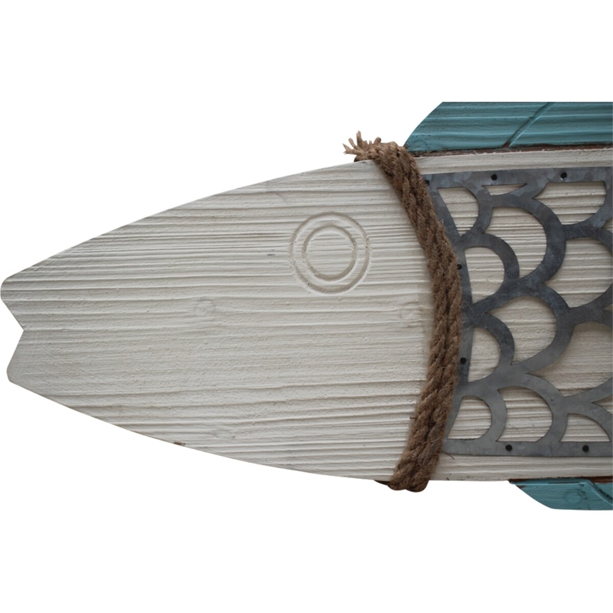 The layered in a sheath of metal scales, the wooden body as if held by the strength of its incredible design - this is one wall décor that will help define the space in the most innovative of ways - after all the very look of the piece reminds one of native tribal art - the simple design - basic shape and yet the powerful usage of imagery and colours. The shape of the fish and the usage of the meta sheath over its body adds to the textural depth of the creation. The usage of rope adds further to its admixture of material and colour. Will happily mingle with all your other marine décor with its very neutral usage of colours. The walls above will revel in the beauty of its 112 cm length that will help define the space in the most definitive of ways. Add one or more such fish to the wall - especially the one that are large and vacant and need that look of drama to set it free from boredom and things too common.