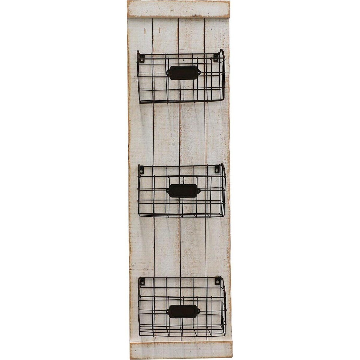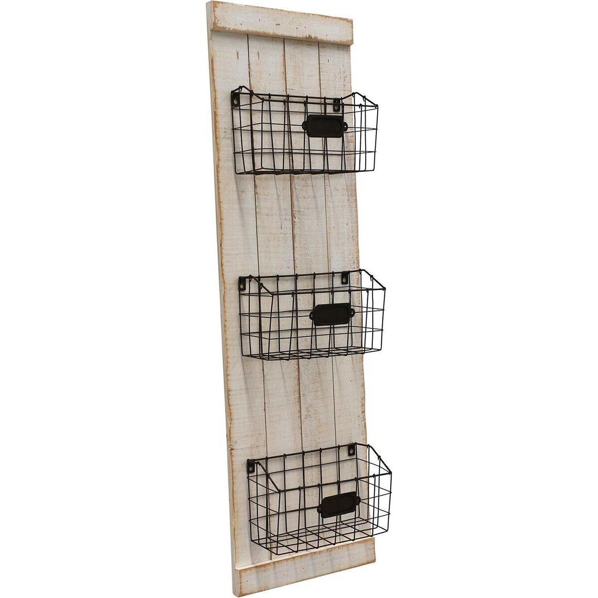 Make your walls count towards giving you more space and even a small little wall space can come in real useful to make spaces look more uncluttered and better organized. Here is a wall bracket that holds three metal baskets in black. They each have been placed on a wooden frame. The baskets are spaced out comfortable on the plank of wood that has very shabby chic features. Rugged and unfinished with rustic paint effect. Use this as an organizer in the study or the children's' room. There is space on the baskets to add a label if needed. So whether it is test papers, or notes of different subjects, magazines or simply bills - there are various reasons to keep such sheets separately to create less of a confusion. The impact of the organizer is so simple yet acutely shabby chic that it does fall into the category of utilitarian décor quite easily. The wood backing is made of reclaimed old pinewood given a wash of white colour that offsets the black metal baskets wonderfully. The height of the frame is 109 cm, its width is 32 cm and the depth of the baskets is 15 cm in all.