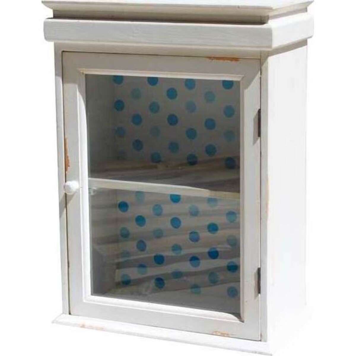 Wall Cabinet Blanc has dimensions of 34x18x47 cm and comprises of single shelf which has front door made of glass with white outer frame and central opening knob. The top part is shaped in artistic form and a blue - spotted backing paper is visible through the glass front and looks beautiful in context of the beautiful white - painted, all - wooden framework utilized. One may have this cabinet fixed into a wall inside a study room or sitting area of a living room. The brilliant white colour it sports can stand out beautifully against an array of interior backgrounds.