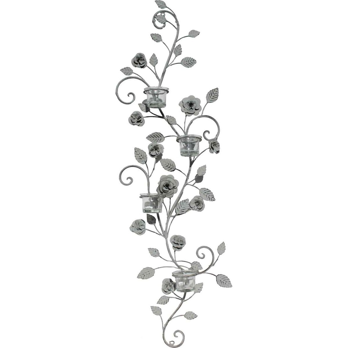 The Wall Candleholder - Hoja Long is elegant and classically beautiful. It is made mainly of twisted iron, flattened metal pieces and glass cups where the candles will be placed.