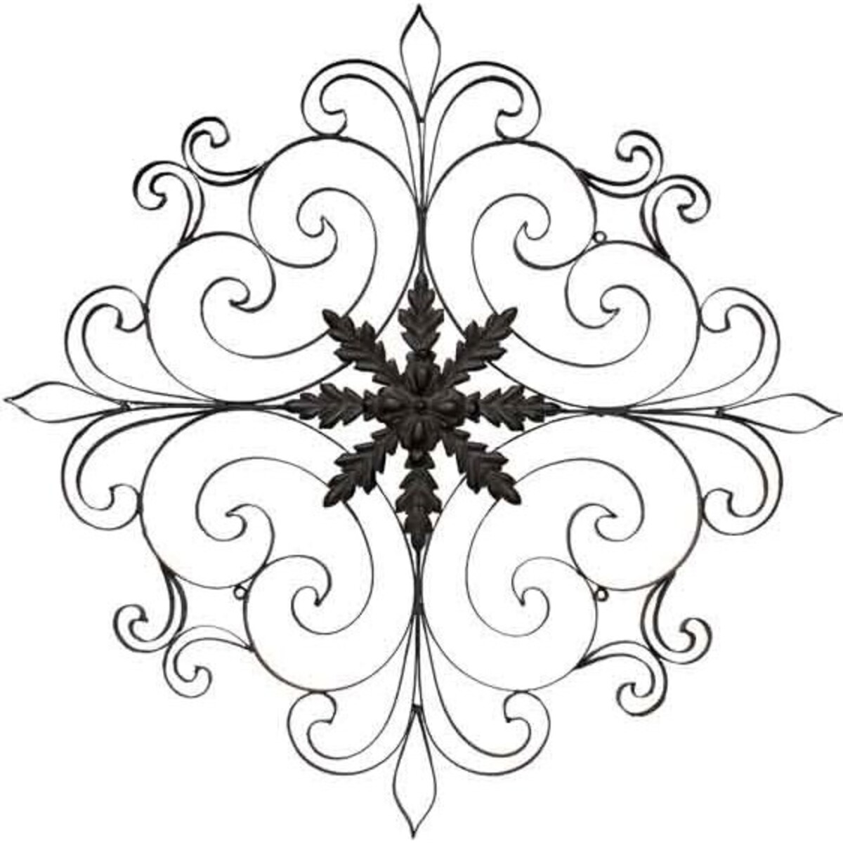 Describing the details, the Wall Decor - Northcote Dark features an intricately detailed snow flake as the centerpiece. Framing the snow flake is a webbing pattern of metal strings that creates symmetrical shapes. Also notable is the Fleur De Lys symbol present in the pattern.