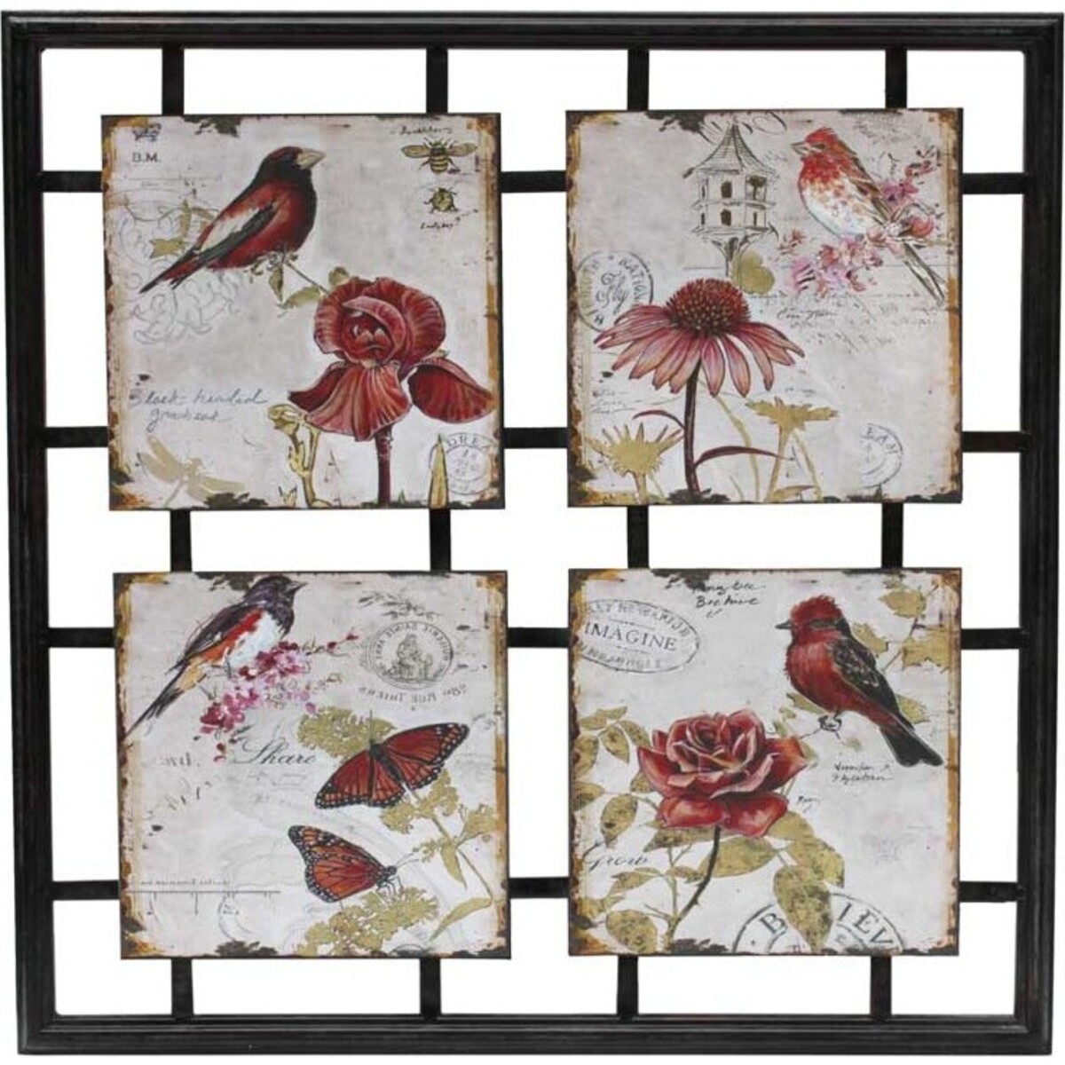 Enjoy these four red coloured birds, flowers and butterflies. The frame is made out of a substance that appears to be iron. It is unique in that it is an accumulation of four individual portraits mounted on to a square shaped base of crisscrossing iron bars. The background is stained to resemble old parchment and includes a romantic engraving of foliage. It would look good displayed almost anywhere to brighten up a dusty corner. The original drawings that the pictures are modeled after were done with painstaking detail and accuracy. A scarlet rose, Echinacea, lily and monarch butterfly dance on the page. Nature lovers as well as gardeners will enjoy the trellis like design and the beautiful natural images.