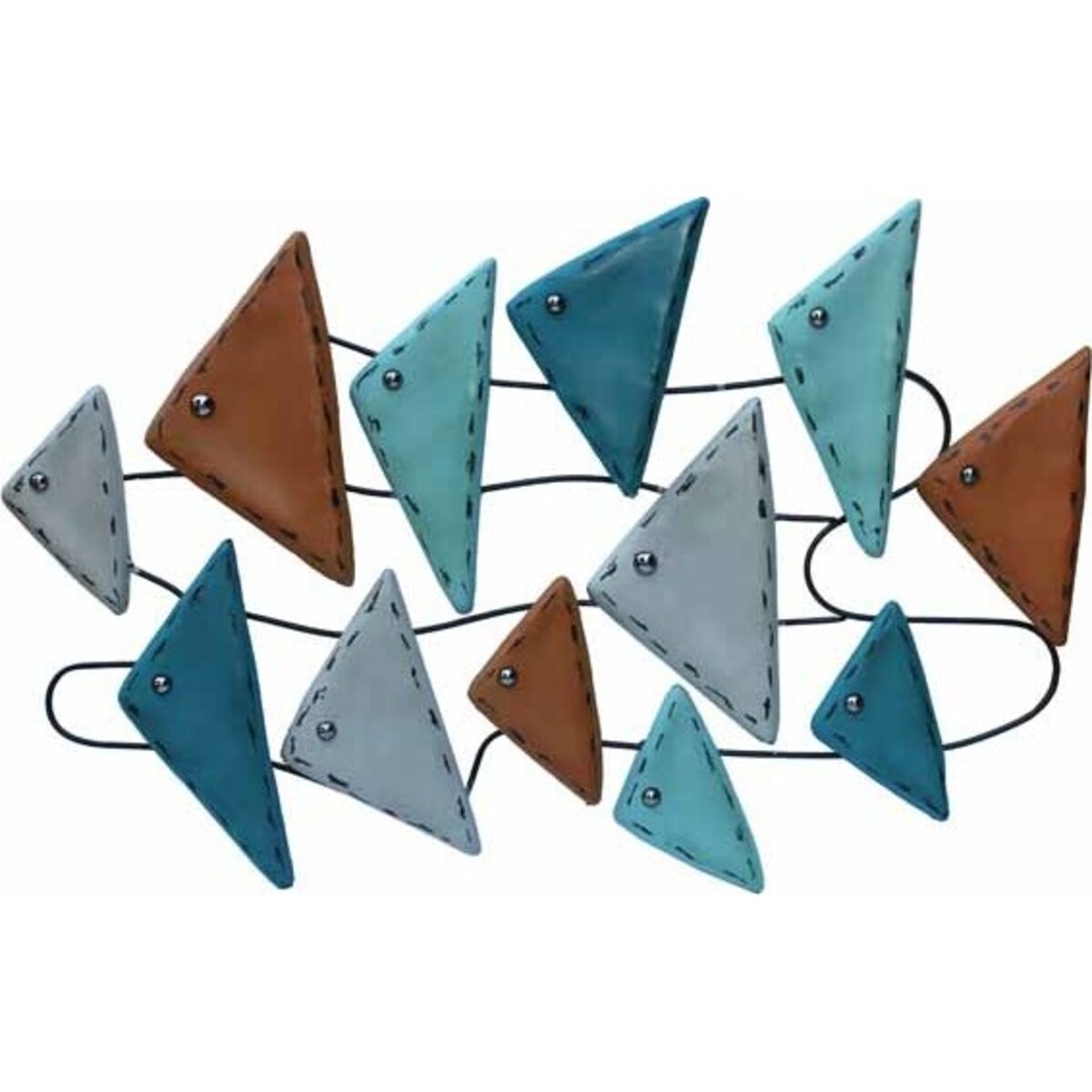 Wall Décor Triangle Fish is made from quality materials with the combination of metals and other durable and versatile pieces. It is intricately and artistically shaped and crafted. The fashionable and contemporary décor shows off different sizes of fish shaped ornate pieces. Each ornate piece of fish is patterned with broken line edges and silver eyes.