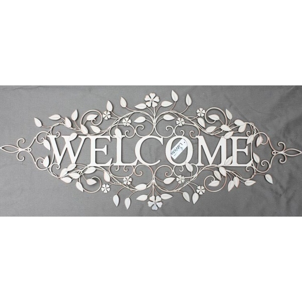 The cream welcome floral wall décor says welcome to all who enter from inside a metal working of flowering vines that have been painted white.