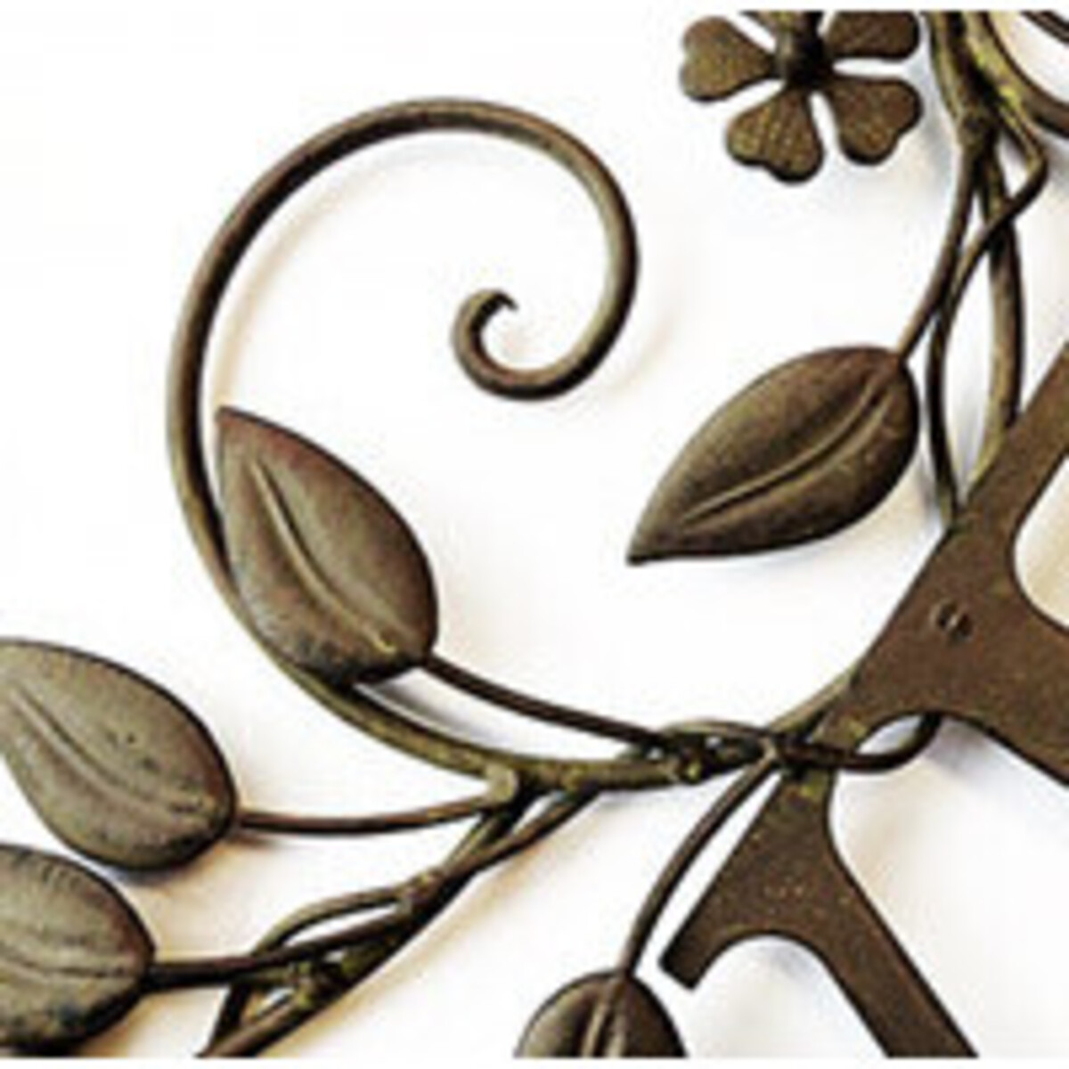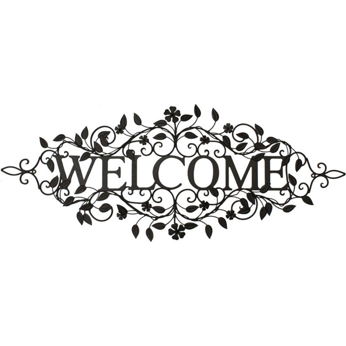The black welcome floral wall décor says welcome to all who enter from inside a metal working of flowering vines that are painted black.