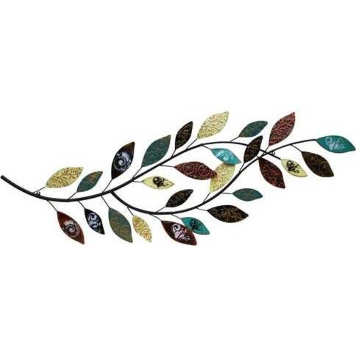A sweeping branch of leaves in stamped metal adds a touch of nature to indoor decor in the Wall Decor Burnish Leaf from LaVida. The metal branch features multicolour leaves in tones of gold, brown, green and burgundy with touches of rust. Etched filigree designs add to the visual interest of this wall hanging. Subtle hangers are welded to the metal for easy hanging. This metal hanging can be displayed along or used in pairs to flank a piece of furniture, a window or doorway. The entire piece measures 44 centimetres wide and 115 centimetres long.