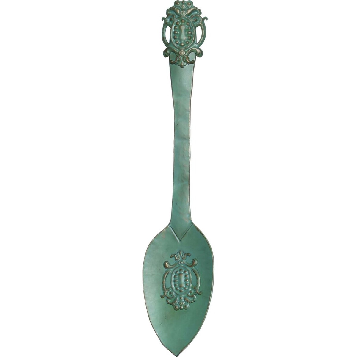 In Norse mythology Embla was one of the first humans to be created along with her husband, Ask. The spoon is made out of a green hued metal. It hangs down to a scooped point that is rather leaf like in shape and colour. The handle and base are decorated with a romantic engraving of foliage. It would look good displayed anywhere that is associated with eating or dining. Places such as the kitchen, dining room, breakfast nook, café, a restaurant or diner. The kitchen is a great place to experiment with unique items to hang on the wall. But the truth is that this Embla Spoon would look good in nearly any place, especially with the matching fork and knife.