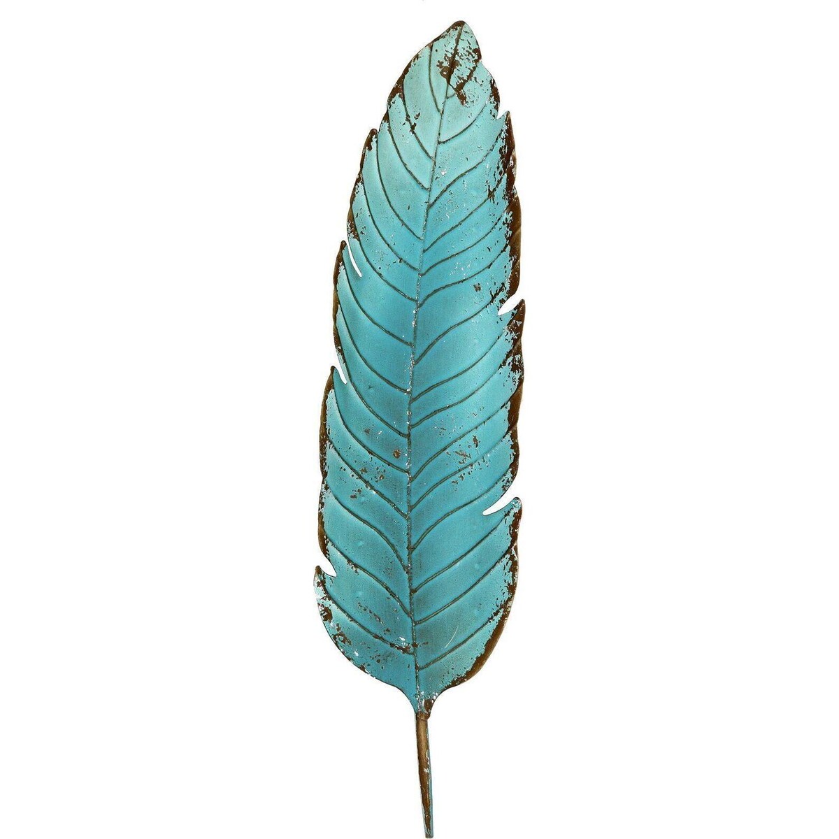 Contemporary homes like to experiment as much with colour, style and form as with themes, yet the one theme that has stood the test of time with minor mutations is that of nature and bringing that to the fore though a wall art is this gorgeous metal hanging shaped like a feather The vividness of the colour lends the piece its most alluring appeal. The feather has been perfectly created with just the right curvature, veins, detailing of the tiny cracks and the proportion. When placed on the wall it will be as tall as 76 cm and can be the focal point f form where you can begin decorating the space. The feather shape being oblong manages to give more space on the sides allowing one to place other articles which may support the theme. The teal shade does wonders to create a colour pop and the rusty edging makes the effect all the more attractive. Beautifully rendered piece of art on metal.