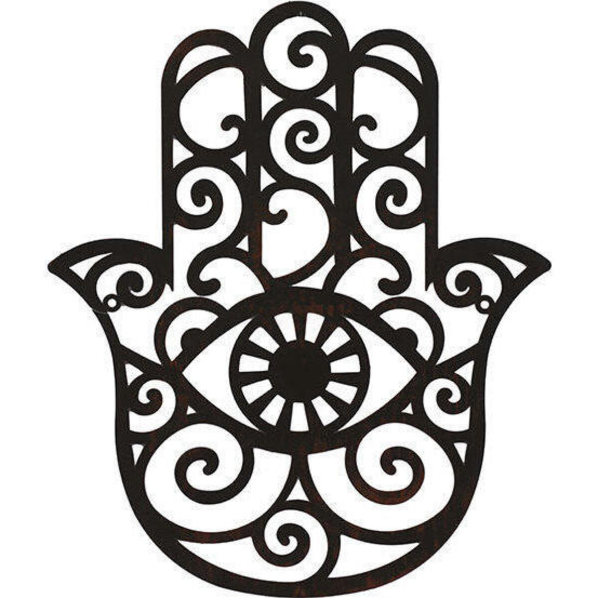 The Hamsa pattern of the hand can be a beautiful means to begin a Boho Chic looking space gain the oriental fair as both in the Kabbala and in Buddhist pantheons, they hold great importance as symbols of strength, compliance with forgiveness and love. It is a protective symbol that nurtures good luck and its value is understood in depth by followers which makes it a wonderful positive presence in any home. Add this metal made symbol to your walls and bring in a transcendental chic feel to your interiors lending it a new feel of the east. This rust coloured hand design with an eye symbol could be easily mounted on the wall and be the most amazing backdrop for your chic look home. The height of the piece is about 42 cm and its width is 36 cm. The almost tattoo and henna pattern look of its design gives it a touch of oriental charm so graceful and ornate in appeal.